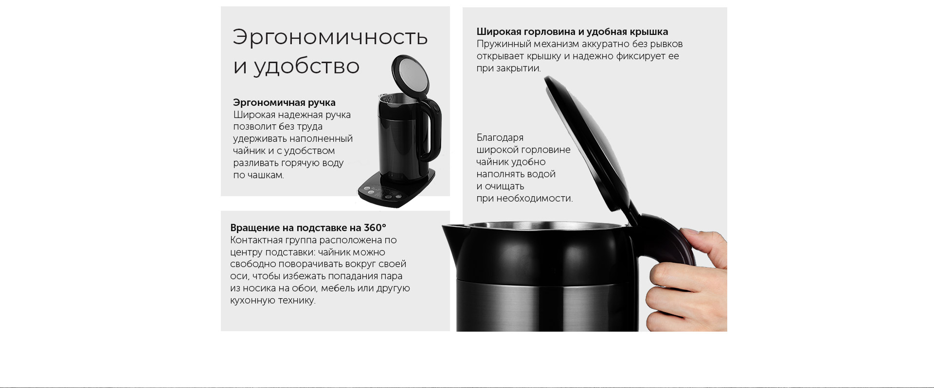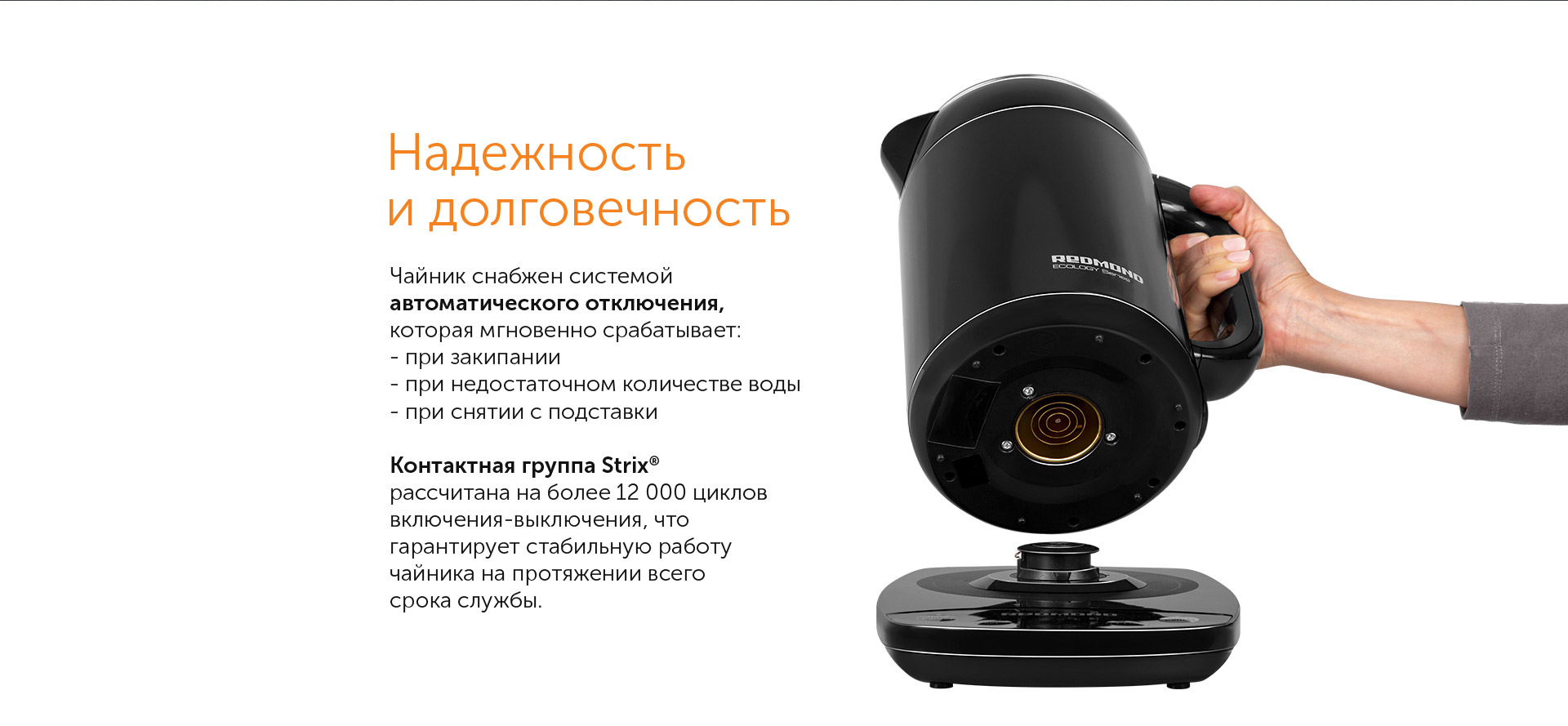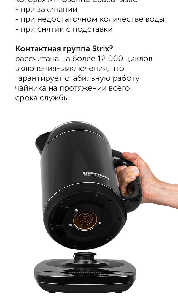 Контроллер и контактная группа Strix® обеспечивают долговечность и безопасность использования устройства. Контроллер автоматически отключает чайник при закипании воды, снятии прибора с подставки во время работы, а также – при отсутствии воды в колбе.