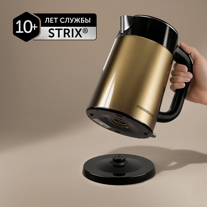 Обеспечит нагрев чайника и отключит его в случае перегрева. Порядка 10 лет — срок службы контактной группы Strix® британского производства. Позволяет вращать чайник на подставке на 360°.