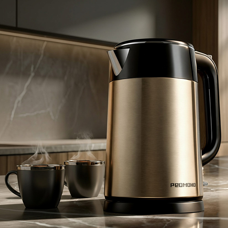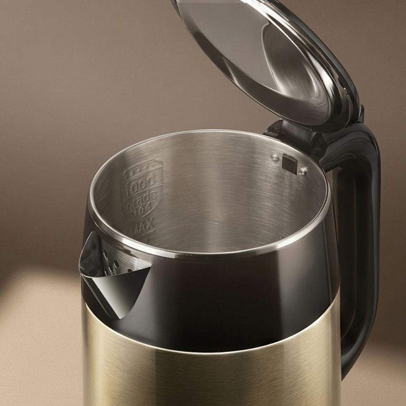 Адиабатный корпус работает как термос — вода долго остается горячей благодаря воздушной прослойке между внутренней колбой и корпусом. Обжечься о чайник нельзя — снаружи он не нагревается.