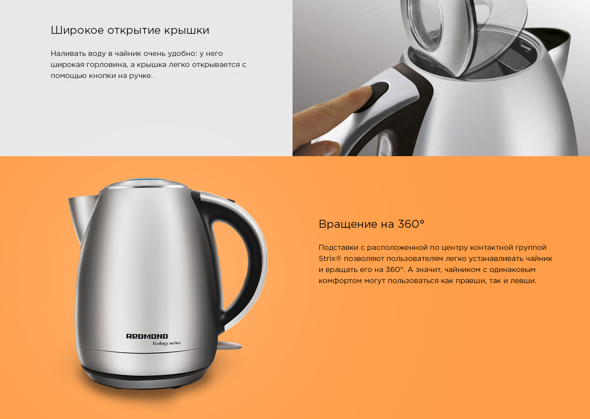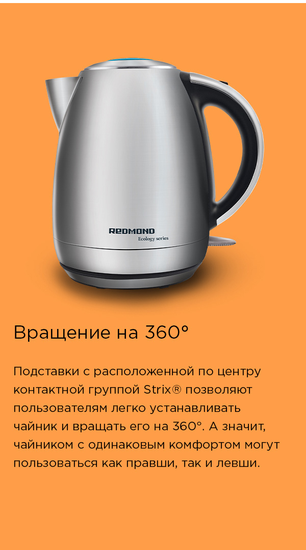 Подставки с расположенной по центру контактной группой Strix® позволяют пользователям легко устанавливать чайник и вращать его на 360°. А значит, чайником с одинаковым комфортом могут пользоваться как правши, так и левши. Кроме того, контактная группа Strix® последней версии позволила реализовать в некоторых чайниках REDMOND возможность выбора температурного режима. Модели чайников с этой опцией могут не только кипятить воду, но и подогревать ее до температур в диапазоне от 40° до 95°C.