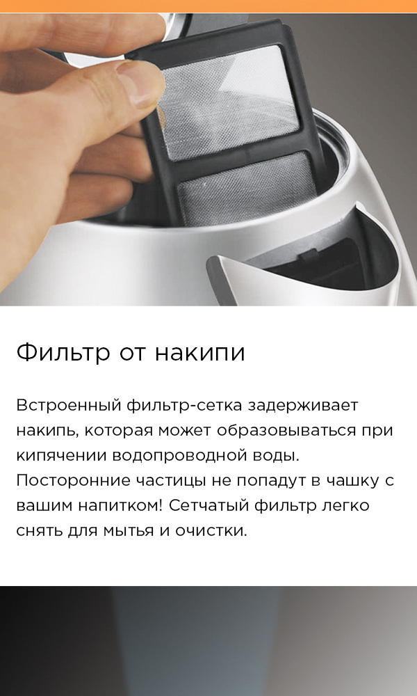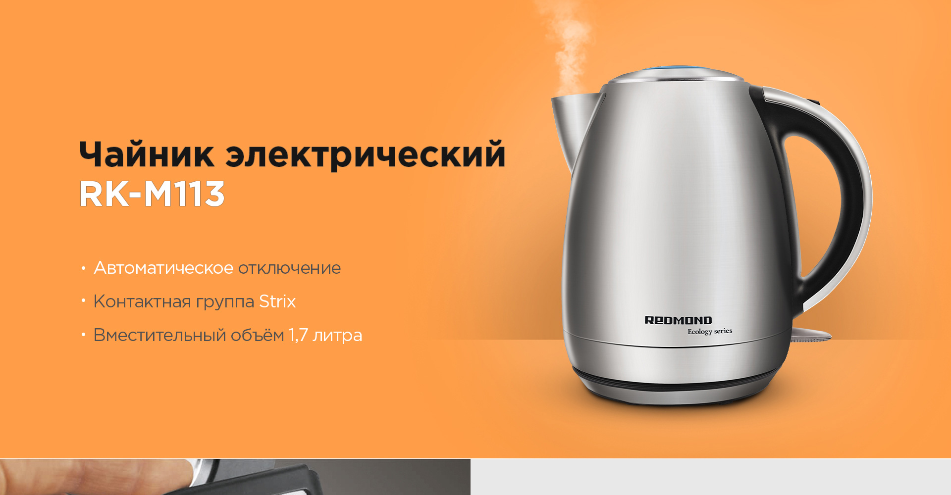 Чайник M113 со смотровым окошком имеет скрытый нагревательный элемент, возможность вращения на подставке на 360°, контактную группу Strix® и съёмный фильтр от накипи.
