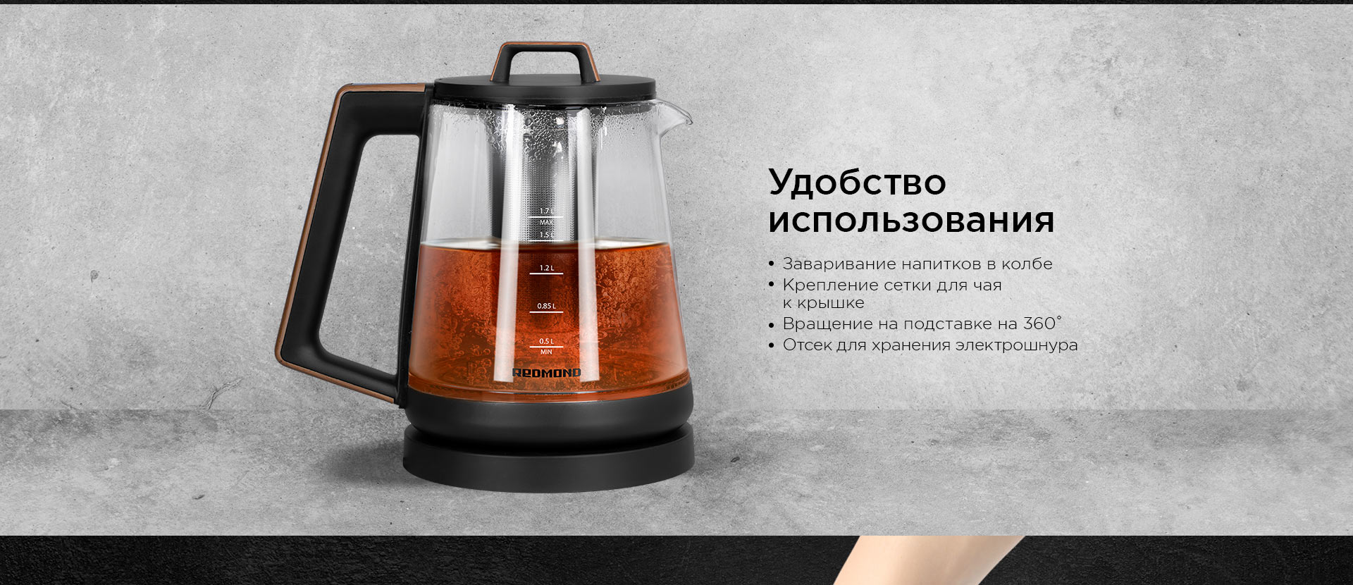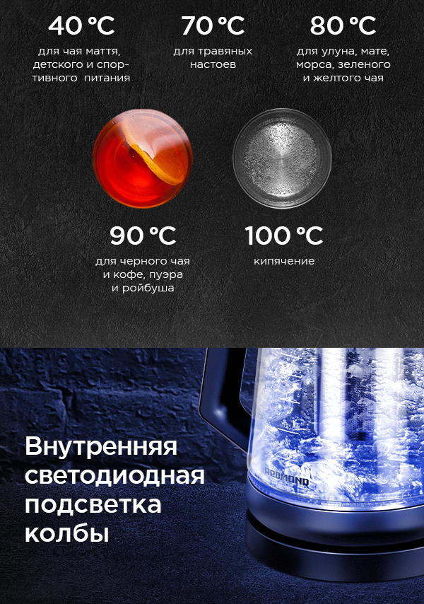 Подставки с расположенной по центру контактной группой Strix® позволяют пользователям легко устанавливать чайник и вращать его на 360°. А значит, чайником с одинаковым комфортом могут пользоваться как правши, так и левши. Кроме того, контактная группа Strix® последней версии позволила реализовать в некоторых чайниках REDMOND возможность выбора температурного режима. Модели чайников с этой опцией могут не только кипятить воду, но и подогревать ее до температур в диапазоне от 40° до 95°C.