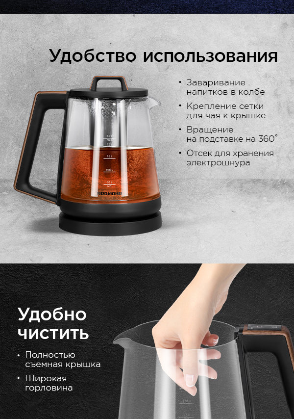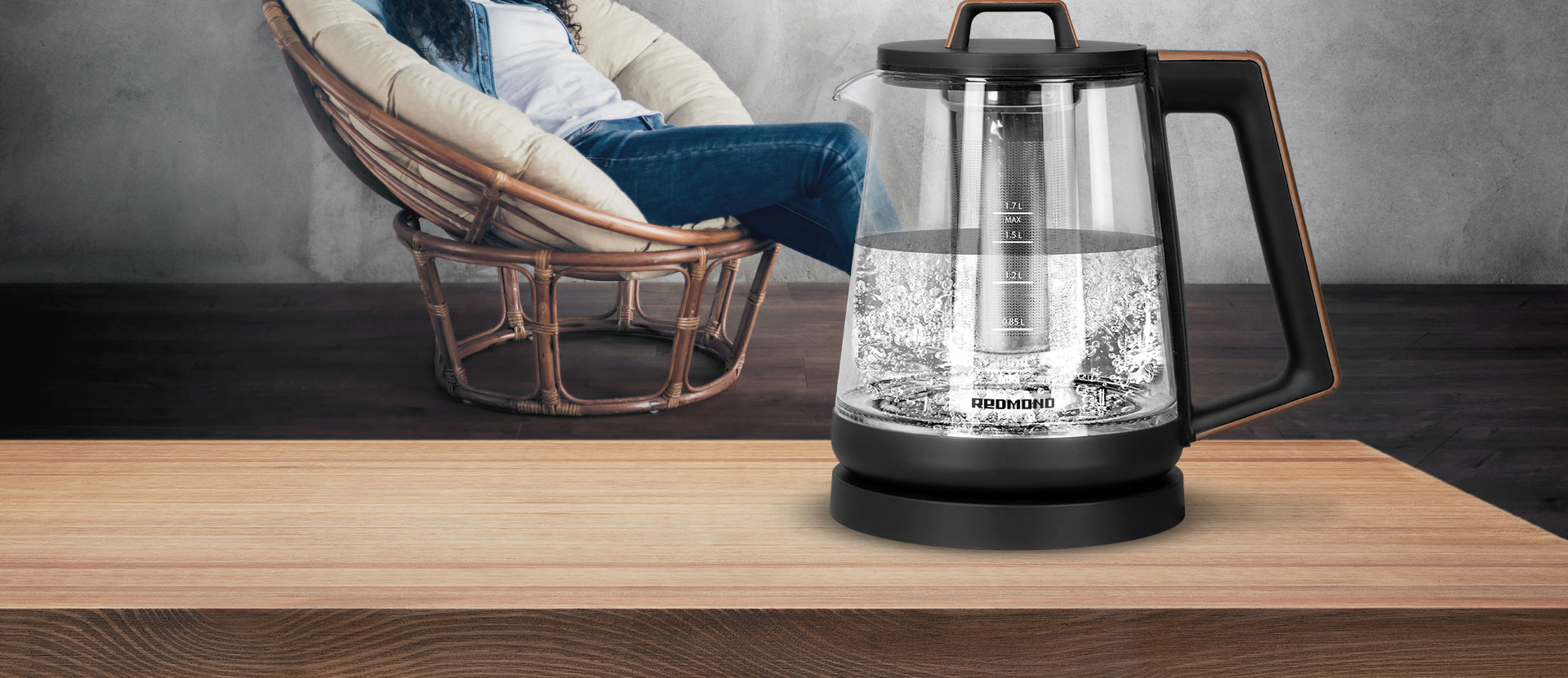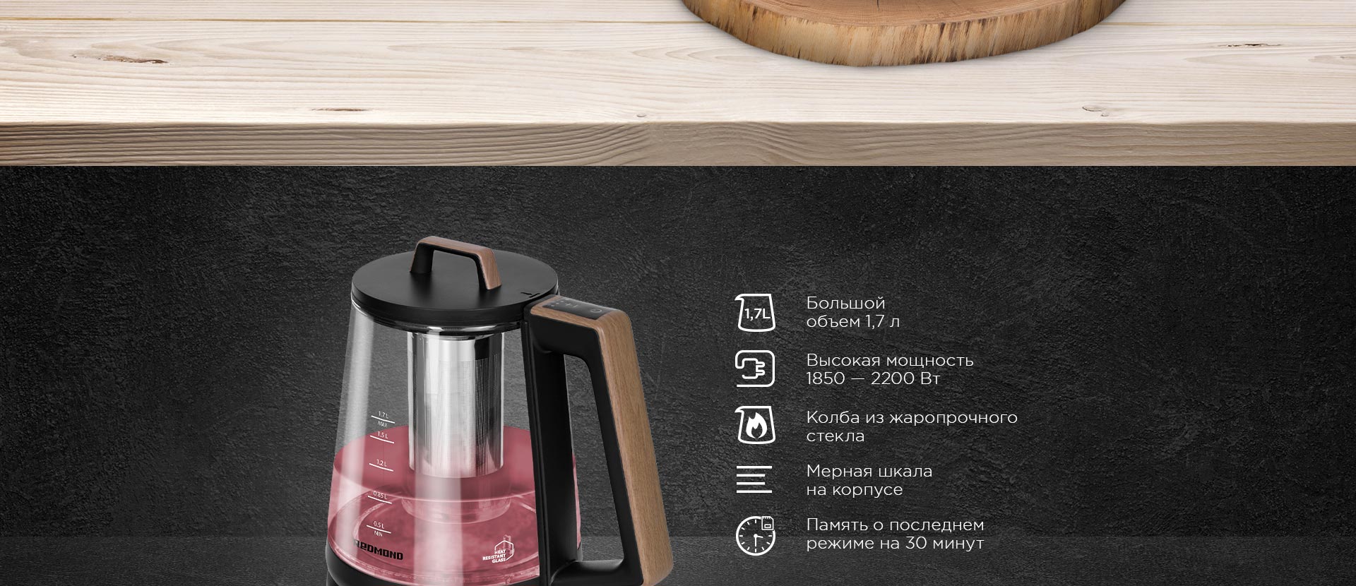 RK-G1309D – это новый мультифункциональный чайник, в котором можно не только подогревать и кипятить воду, но и заваривать ароматный чай, готовить травяные настои и делать морс. Матовый черный пластик в сочетании со вставками под дерево на ручке и крышке делают чайник идеальным аксессуаром для кухни в стиле лофт, контемпорари, гранж, модерн или индастриал.