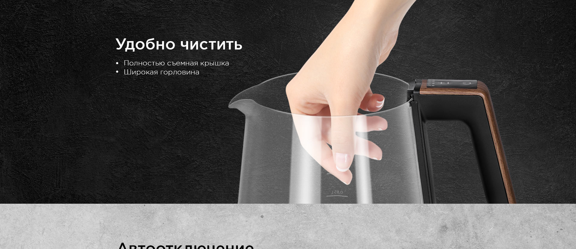 Круглая крышка чайника полностью снимается, а широкая горловина позволяет легко наливать воду в колбу, а также мыть ее изнутри. Сама колба выполнена из термостойкого стекла.