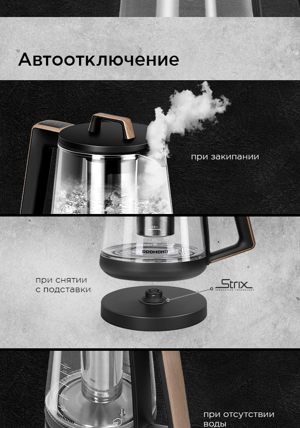 Благодаря контроллерам Strix® чайники REDMOND могут автоматически выключаться при закипании воды, перегреве, а также – если в колбе отсутствует вода или прибор был снят с подставки во время работы. Согласно внутренним тестам компании Strix®, контроллеры обеспечивают минимум до 12000 циклов закипания.