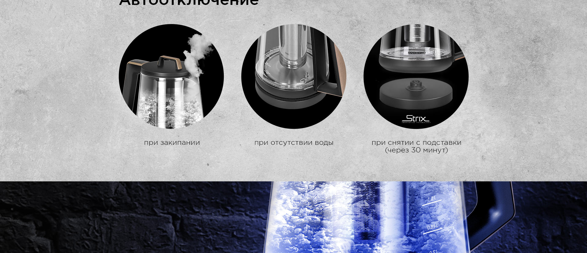 Контактная группа Strix®** обеспечивает полностью безопасное использование прибора – чайник автоматически выключается при закипании, снятии с подставки и при отсутствии воды в колбе.