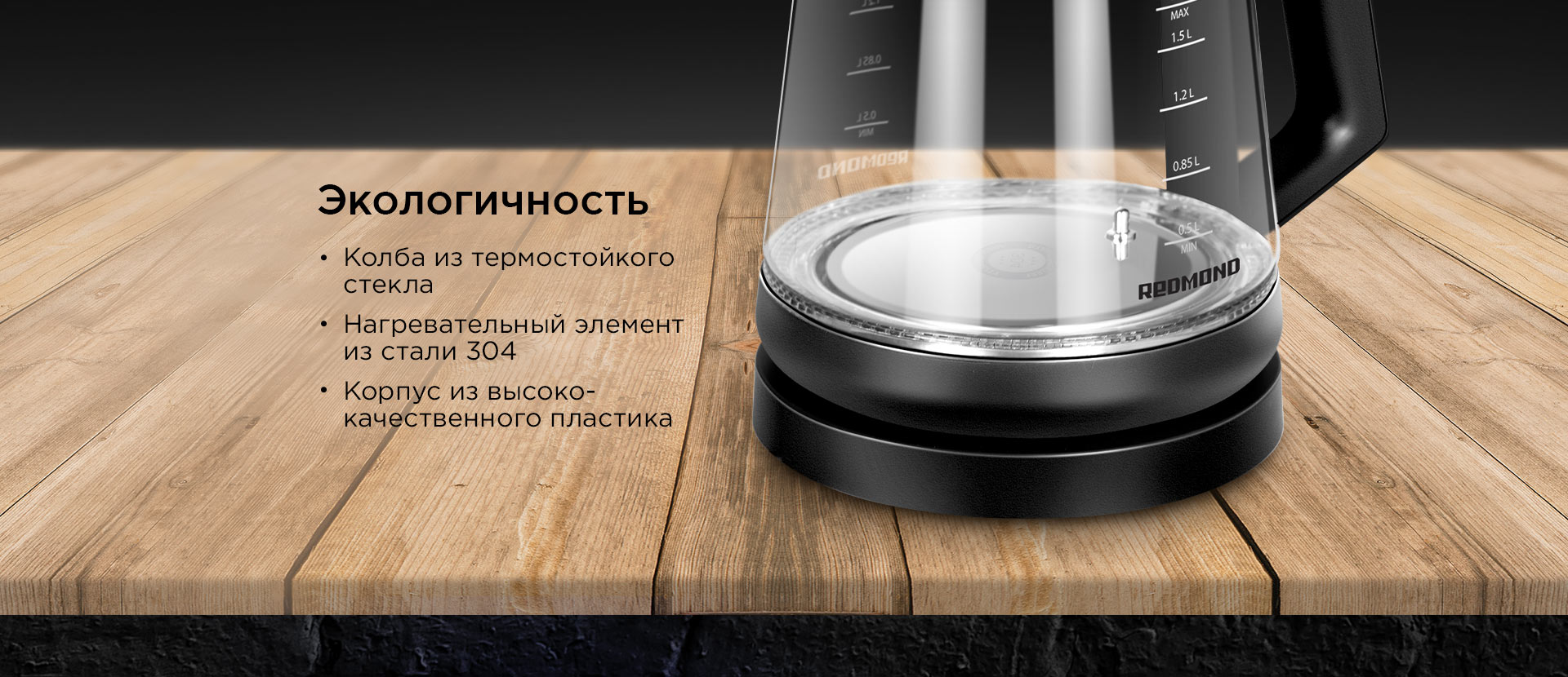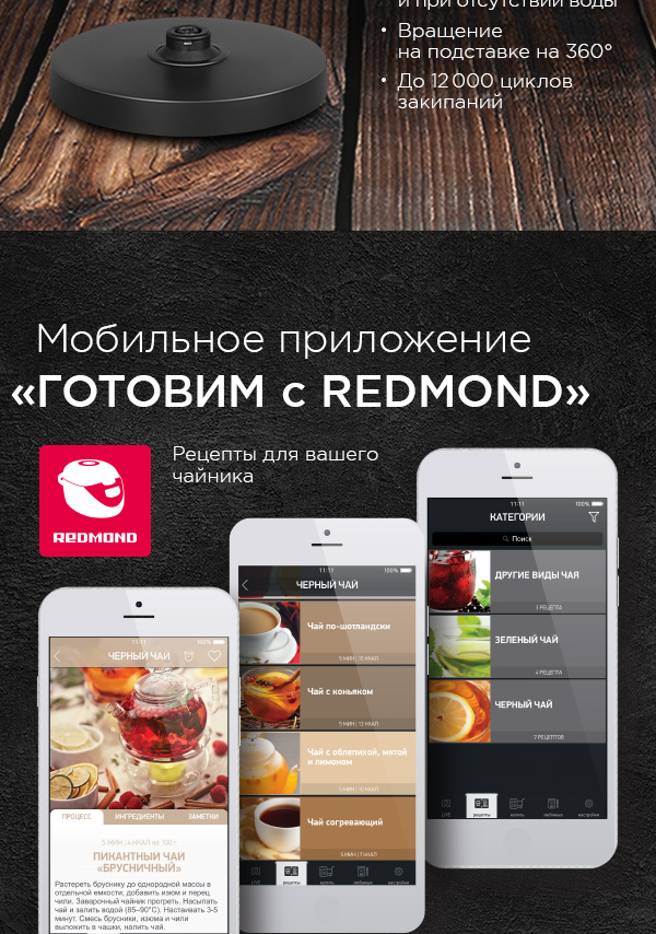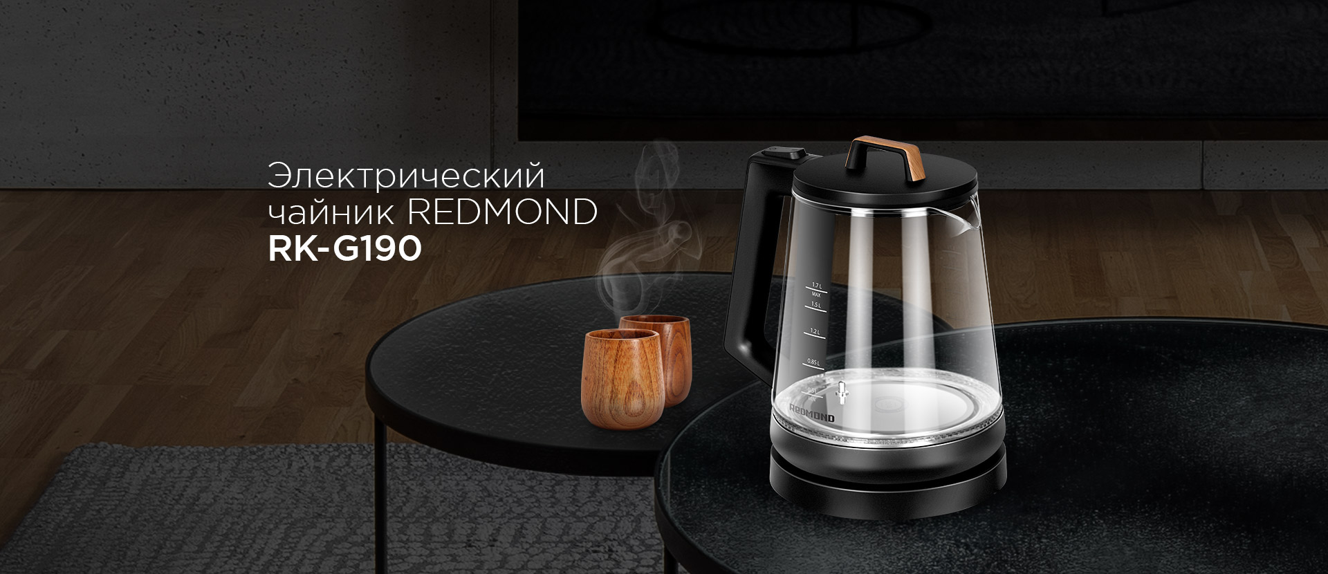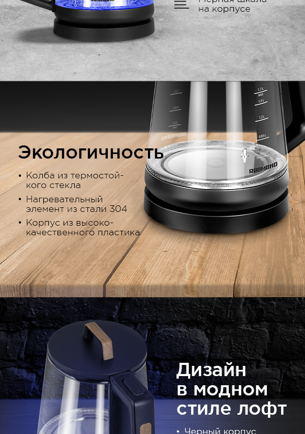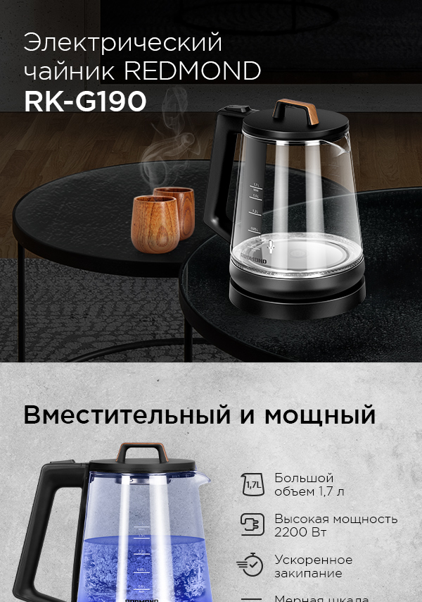 REDMOND RK-G190 – современный электрический чайник для быстрого нагрева и кипячения воды. В дизайне чайника RK-G190 органично сочетаются три фактуры: прозрачное стекло, матовый черный пластик и имитация древесины. Благодаря этому чайник впишется в любое пространство с современным интерьером.