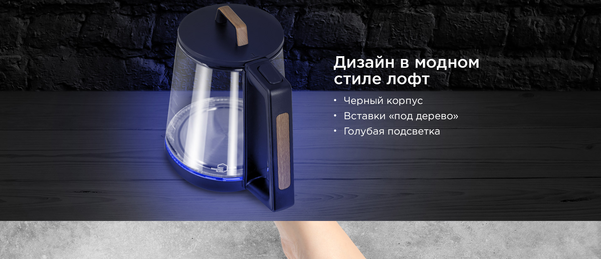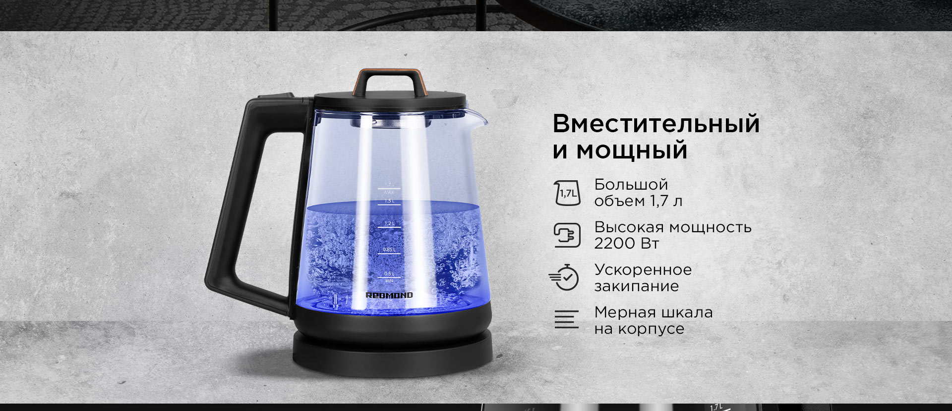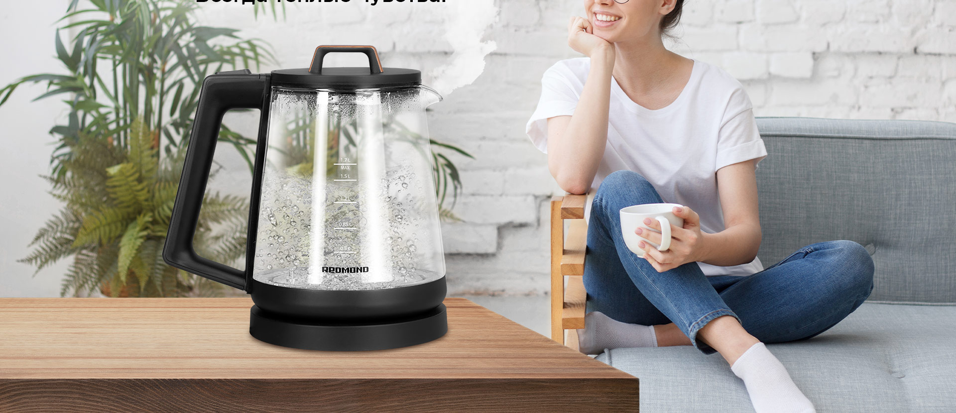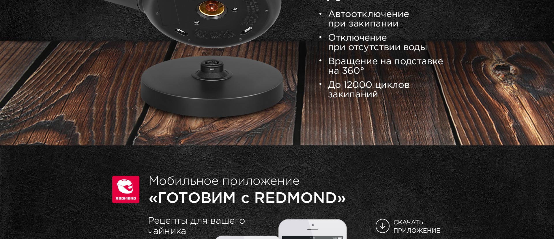 REDMOND RK-G190 – современный электрический чайник для быстрого нагрева и кипячения воды. В дизайне чайника RK-G190 органично сочетаются три фактуры: прозрачное стекло, матовый черный пластик и имитация древесины. Благодаря этому чайник впишется в любое пространство с современным интерьером.