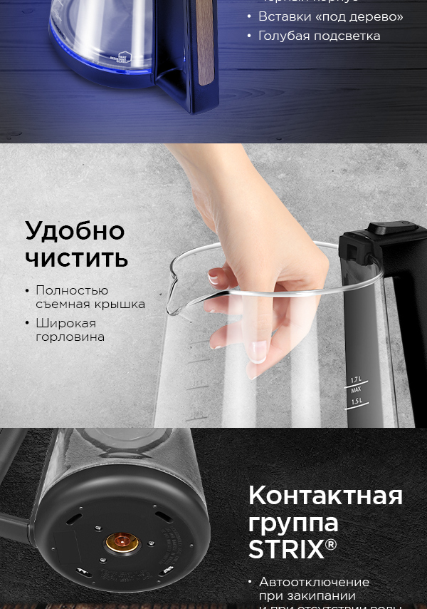 Чайник REDMOND оснащен надежной контактной группой STRIX®, благодаря которой прибор автоматически отключается при закипании и отсутствии воды. Удобное расположение контактной группы по центру позволяет вращать чайник на подставке на 360°С. Заметили, что пар при кипячении попадает на метель или бытовую технику? Просто разверните чайник на подставке в нужную сторону.