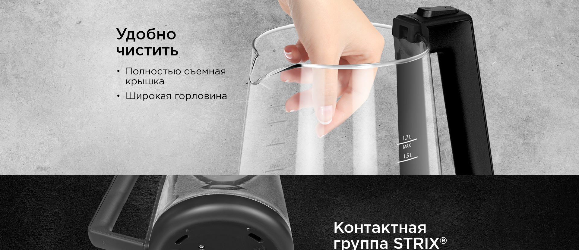 Модель RK-G190 оснащена съемной крышкой. Благодаря ей, а также широкой горловине, чайник легко наполнять водой и при необходимости очищать. В отличие от автоматической крышки, съемная зачастую оказывается более долговечной.