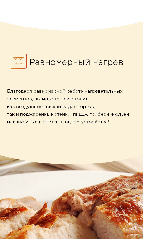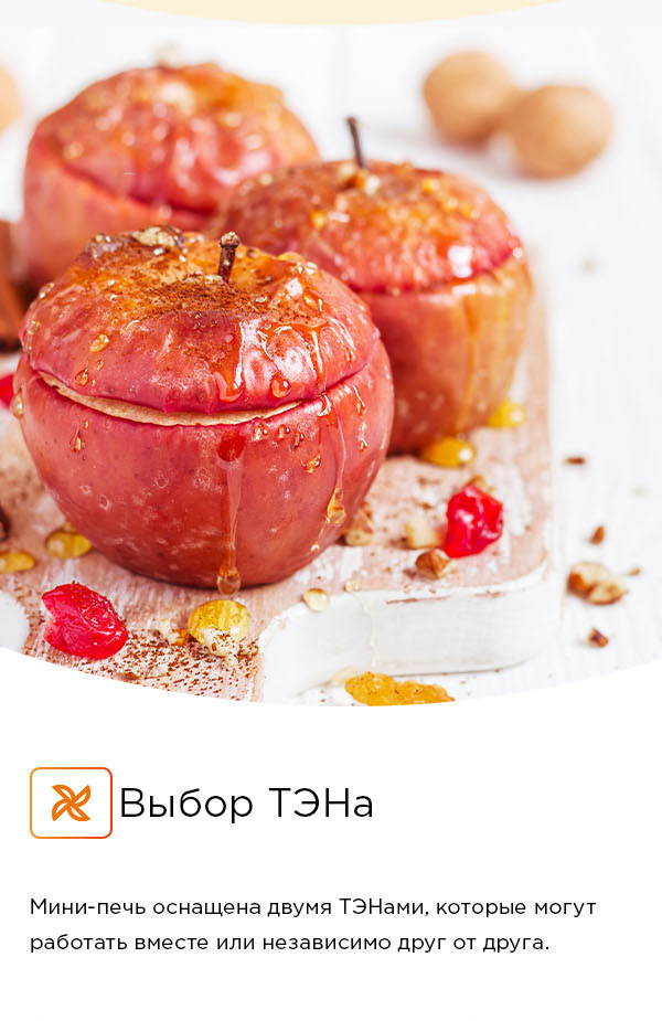 В мини-печи RO-5703 установлено 2 нагревательных элемента, которые могут работать как независимо друг от друга, так и одновременно. Верхний ТЭН позволяет идеально поджарить рыбные и мясные стейки, отбивные из птицы и свинины. Нижний ТЭН отлично подходит для готовки разнообразной выпечки: пышных бисквитов, нежных пирогов или хрустящего печенья. А два одновременно работающих ТЭНа помогут добиться красивой ровной корочки на кексах или хлебе. Какое блюдо бы вы ни готовили, в мини-печи RO-5703 оно отлично пропечется и зажарится.