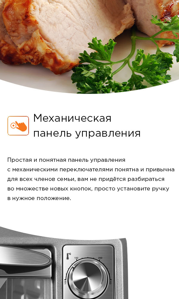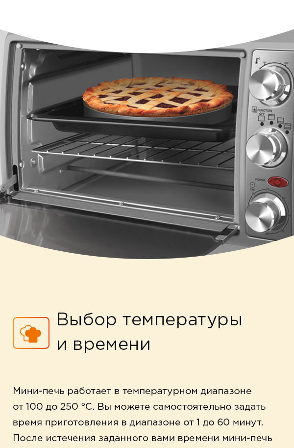 Таймер до 1 часа. Температура нагрева от 100 до 250 градусов. Механическая регулировка. Есть поддон для крошек. Печь полностью оправдала ожидания. Корпус из металла, все сделано прочно. Гарантия большая. Цена даже немного удивила, оказалось дешевле, чем рассчитывал.