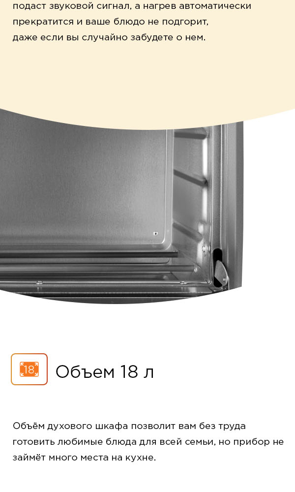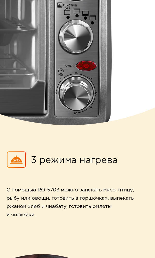 Мини-печь RO- работает в температурном диапазоне от 100 до 250 °C. В зависимости от рецепта вы можете установить время готовки от 1 минуты до 1 часа. При этом можно не бояться забыть о блюде и пересушить его, так как модель 5703 оснащена таймером. По истечении заданного вами времени мини-печь подаст звуковой сигнал и выключит нагрев. Если к положенному сроку продукты ещё не приготовились, просто добавьте время работы поворотом ручки установки температуры.