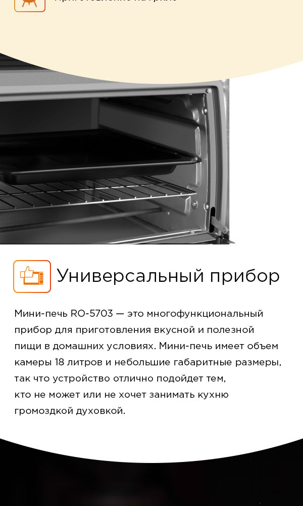 Мини-печь RO-5703 – это многофункциональный прибор для приготовления вкусной и полезной пищи в домашних условиях. Мини-печь имеет объем камеры 18 литров и небольшие габаритные размеры, так что устройство отлично подойдет тем, кто не может или не хочет занимать кухню громоздкой духовкой.