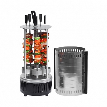 Электрошашлычница жарит мясо при помощи трубчатого нагревателя, который разогревает воздух внутри корпуса. Чтобы мясо приготовилось равномерно, шампуры вращаются, не давая мясу подгореть.