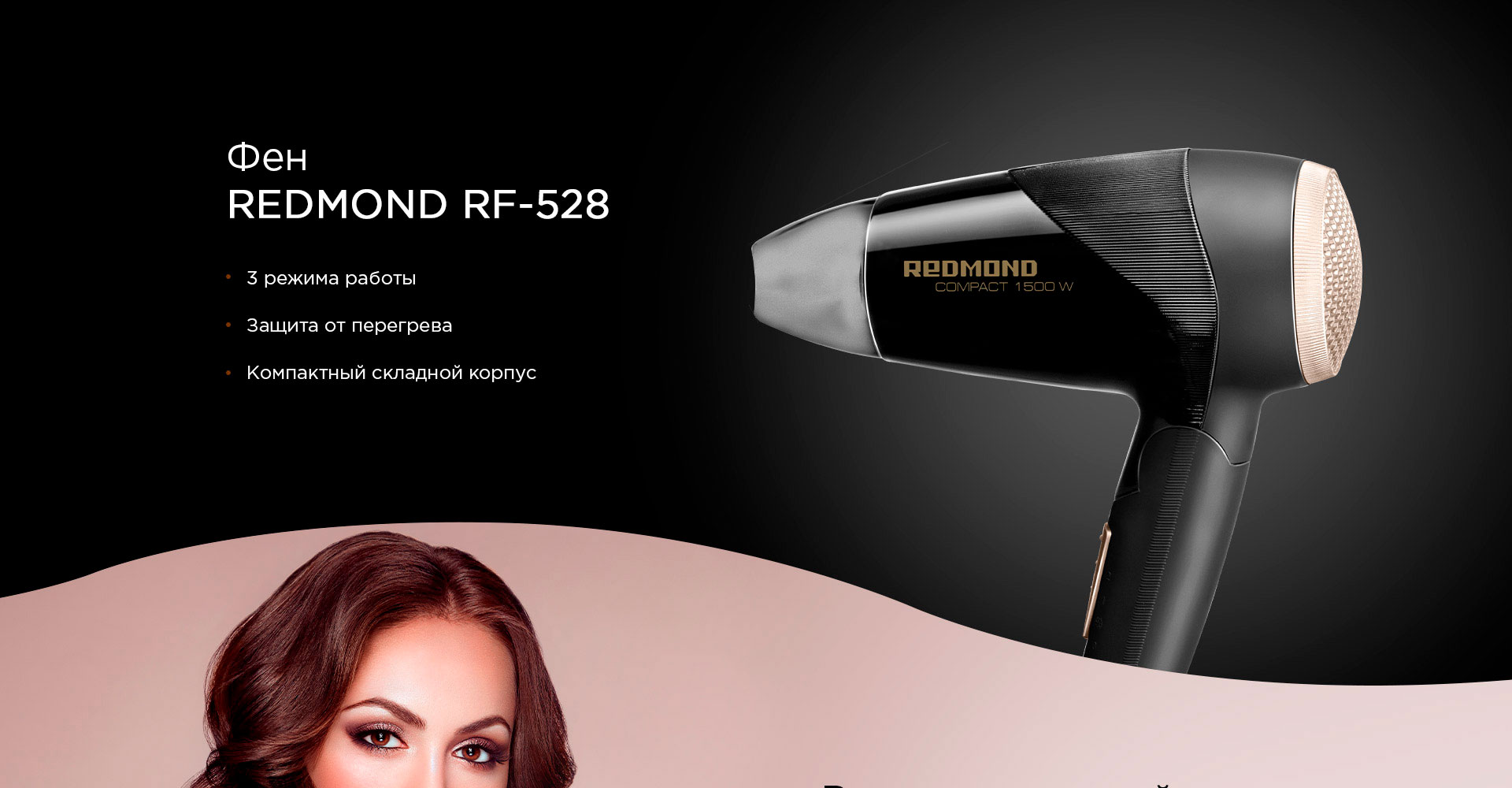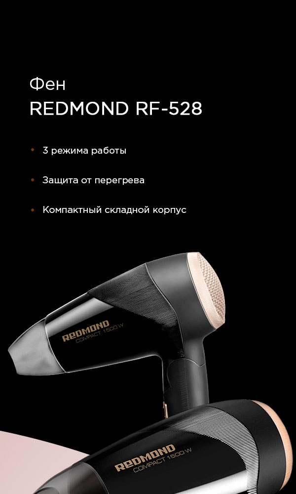 REDMOND RF-528 – это стильный компактный фен для максимально удобной и безопасной сушки и укладки волос. Благодаря небольшим размерам и складной ручке вы сможете с легкостью взять фен с собой в командировку или в отпуск.
