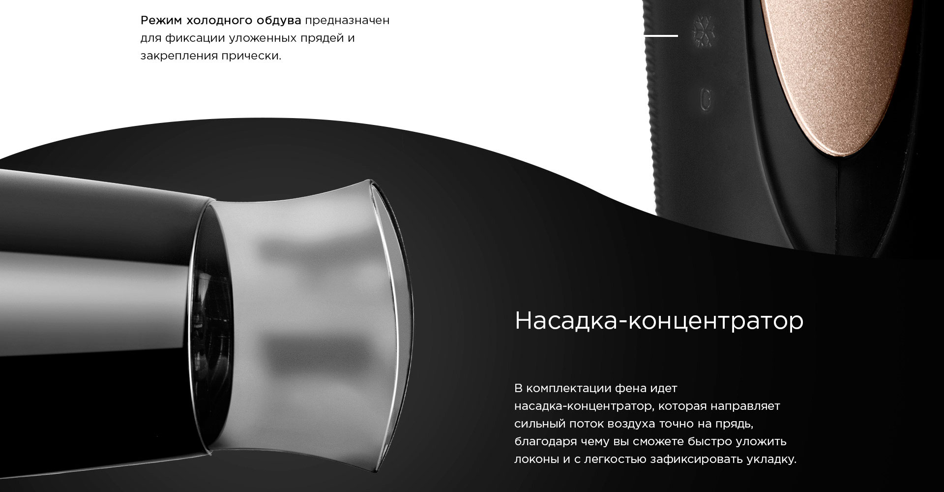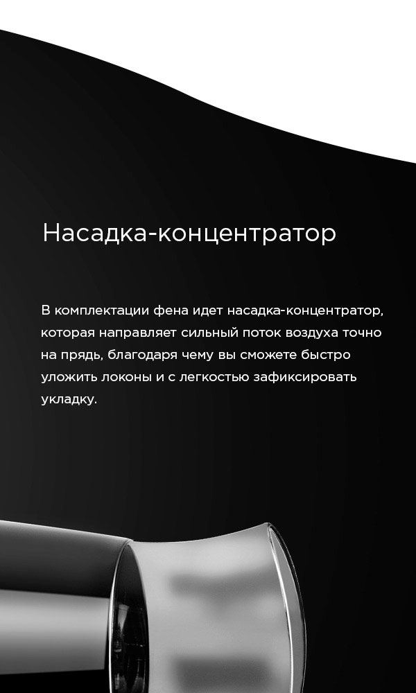 В комплектации фена идет насадка-концентратор, которая направляет сильный поток воздуха точно на прядь, благодаря чему вы сможете быстро уложить локоны и с легкостью зафиксировать укладку.