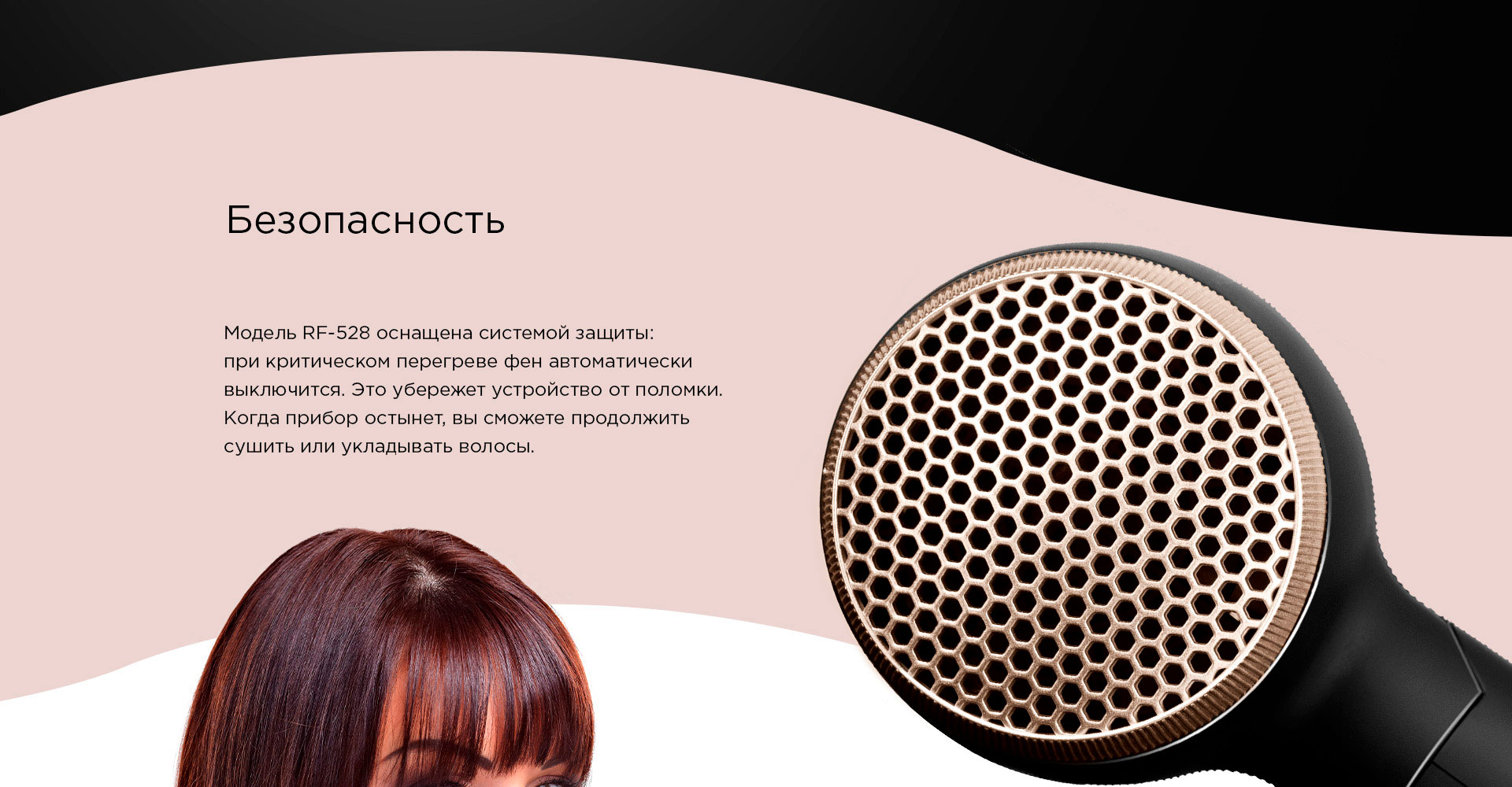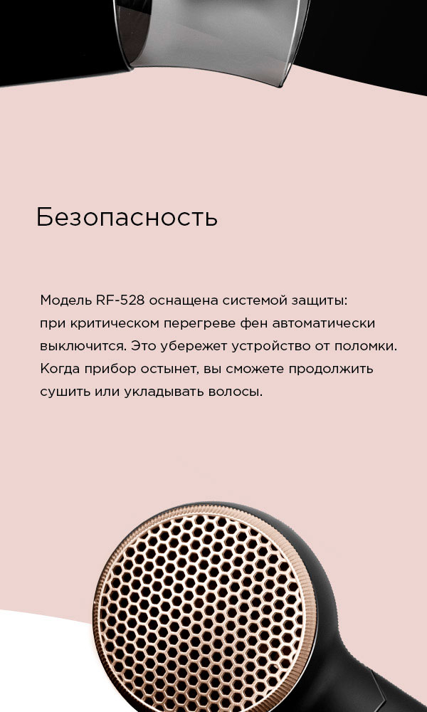 Модель RF-528 оснащена системой защиты: при критическом перегреве фен автоматически выключится. Это убережет устройство от поломки. Когда прибор остынет, вы сможете продолжить сушить или укладывать волосы.