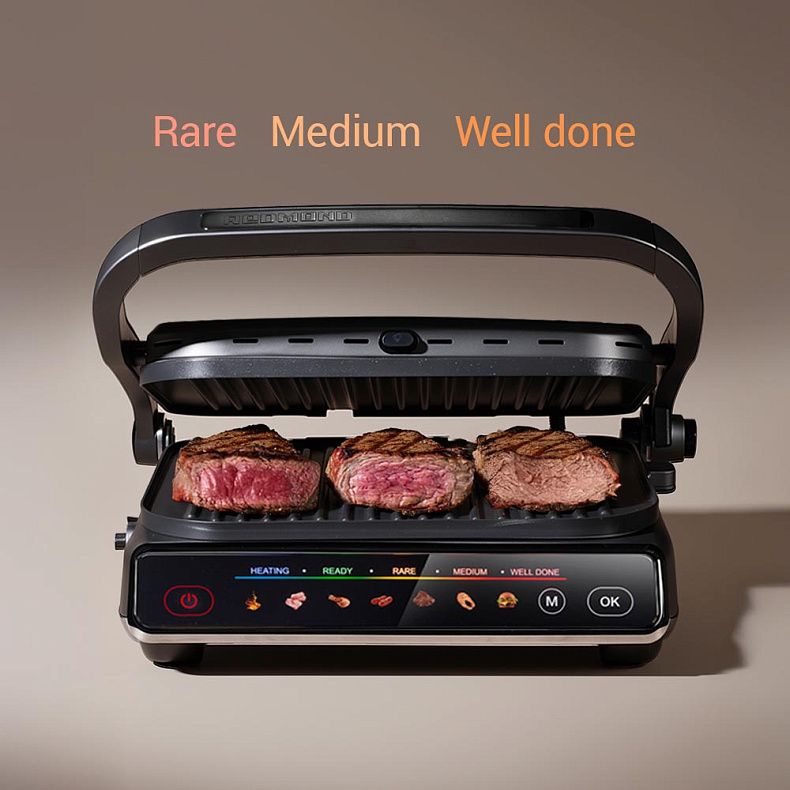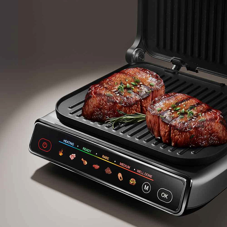 Выбирайте степень прожарки Rare, Medium или Well Done для стейков как в ресторане. Мощные нагревательные элементы обеспечивают быстрый нагрев, мясо сохраняет соки внутри, а корочка получается золотистой и ароматной. Готовка остается простой, а результат — впечатляющим.
