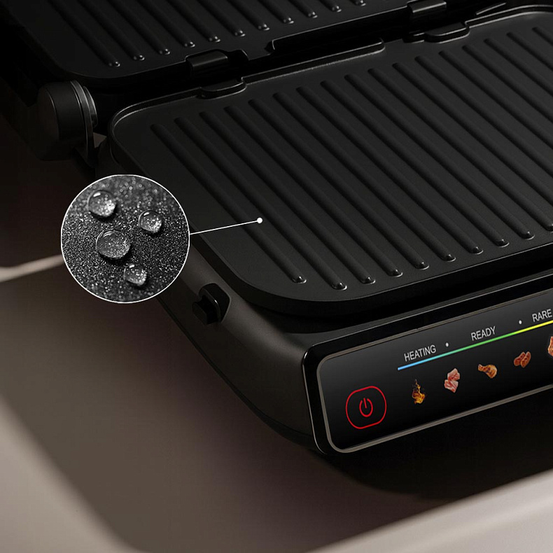 SmartGrill самостоятельно определяет толщину продукта и рассчитывает точное время приготовления с точностью до секунды. Мясо, рыба или овощи готовятся идеально с первого раза. Благодаря встроенным нагревательным элементам и высокой мощности 2100 Вт, тепло распределяется равномерно.