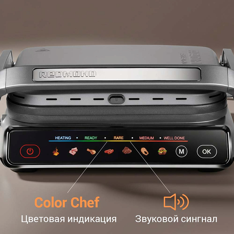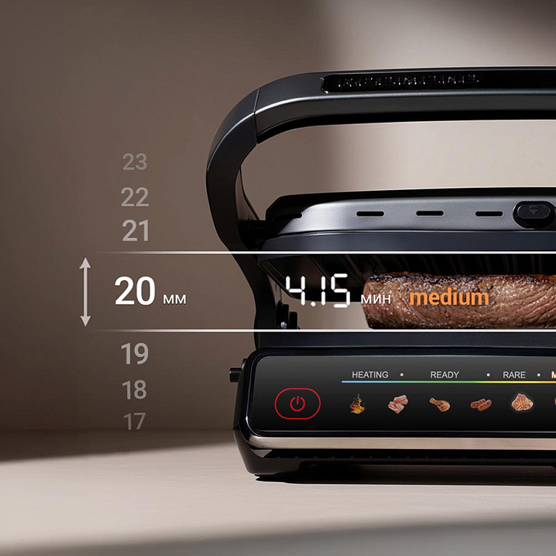 Гриль подскажет, когда стейк достиг нужной степени прожарки, с помощью цветовой шкалы и звуковых сигналов. Вы можете быть уверены, что Rare не превратится в Medium, а Medium — в Well Done. Настройка времени и температуры вручную дает полный контроль, если хотите следовать своим рецептам.