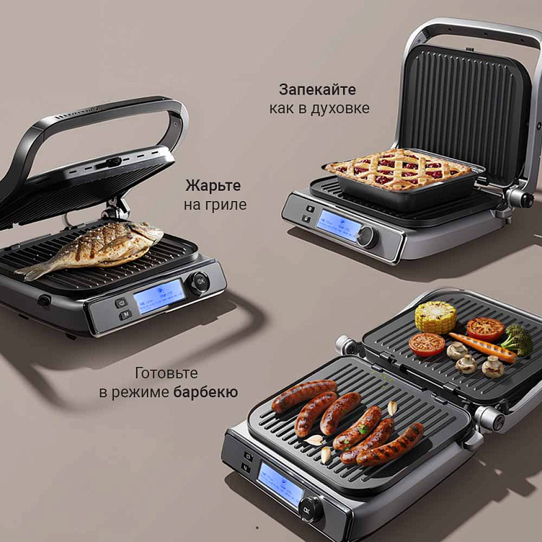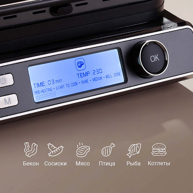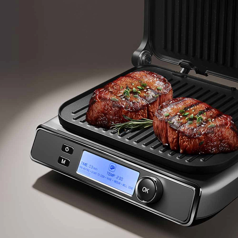 Гриль оснащен автопрограммами для мяса, рыбы, птицы, сосисок, бекона, бургеров и разогрева — он сам подбирает оптимальные температуру и время приготовления. Если хотите больше контроля, включите ручной режим и настройте температуру и время самостоятельно.