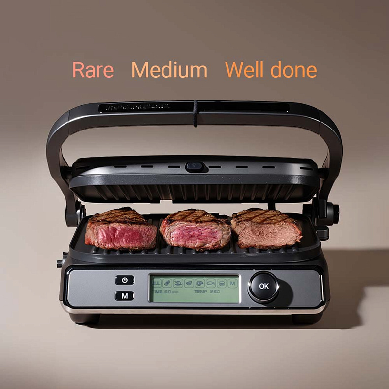 РЕДМОНД GM301 готовит стейки точной степени прожарки — Rare, Medium или Well Done. Когда мясо достигает нужного состояния, прибор подает звуковой сигнал, а на дисплее загорается соответствующая индикация. Мясо получается ароматное, с аппетитной корочкой и сочной серединой.
