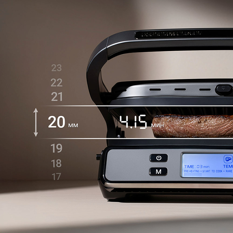 Интеллектуальная система SmartGrill определяет толщину ингредиента и автоматически рассчитывает оптимальное время готовки с точностью до секунды. Вам не нужно контролировать процесс, достаточно выбрать автоматическую программу, чтобы прибор сам обеспечил нужную прожарку для колбасок, мяса или овощей.