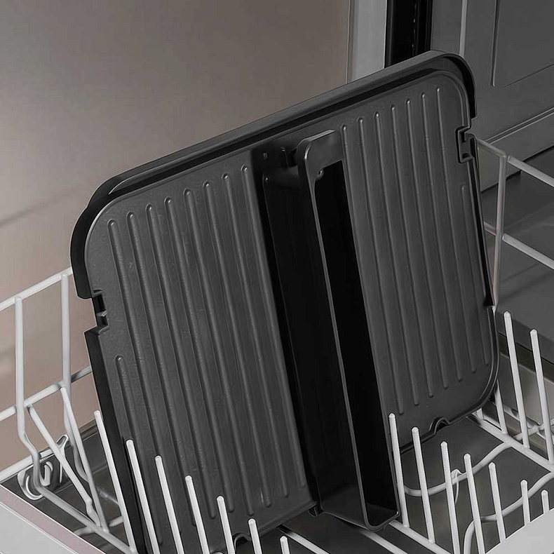 Съемные панели и лоток для жира можно мыть в посудомоечной машине. После готовки достаточно снять эти элементы, а после очистки вернуть на место — прибор готов к следующему использованию.