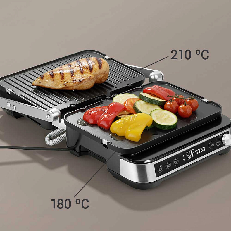 Для каждой панели можно установить нужную температуру от 80 до 230 °C. Раскройте крышку на 180 градусов и готовьте, например, на одной стороне куриные крылья при 210 °C, на другой овощи при 180 °C. Продукты получатся сочными и равномерно приготовленными.
