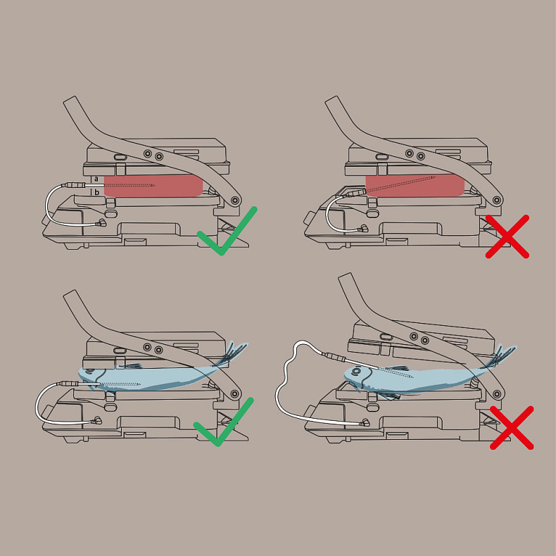 Чтобы добиться максимально точного результата, устанавливайте термощуп в самую толстую часть продукта, строго в середину — параллельно панели гриля. Такой способ размещения обеспечивает корректное измерение внутренней температуры. Закладывайте продукты примерно одного размера и толщины, тогда они приготовятся равномерно и одновременно достигнут нужной степени готовности.