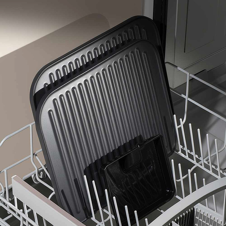 Панели отсоединяются без усилий, лоток для сбора жира вынимается одним движением. Все эти элементы можно загрузить в посудомоечную машину вместе с тарелками после ужина. Не нужно использовать агрессивную химию и рисковать поцарапать покрытие. Это особенно важно, если готовите часто и не хотите тратить время на дополнительную работу.