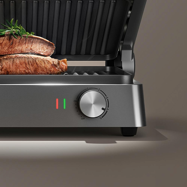 Контактный гриль быстро достигает нужной температуры. Не приходится долго ждать, пока панели прогреются. Плавный регулятор температуры устроен иначе, чем ступенчатые переключатели: можно установить точное значение, чтобы идеально приготовить мясо, овощи или рыбу. Устройство оснащено защищено от перегрева, поэтому прослужит дольше.