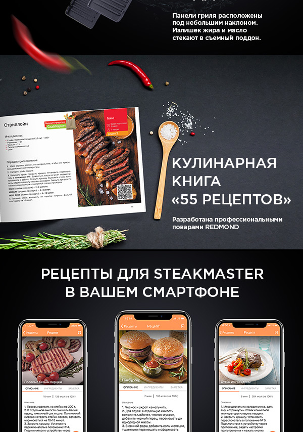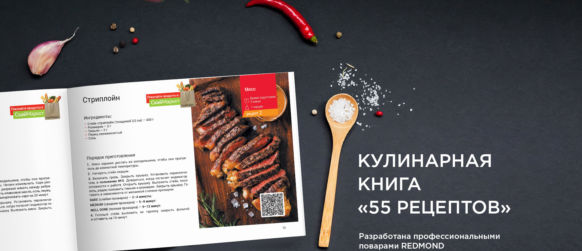 В дополнение к грилю вы получите кулинарную книгу от поваров REDMOND с пошаговыми инструкциями и рекомендациями по приготовлению.