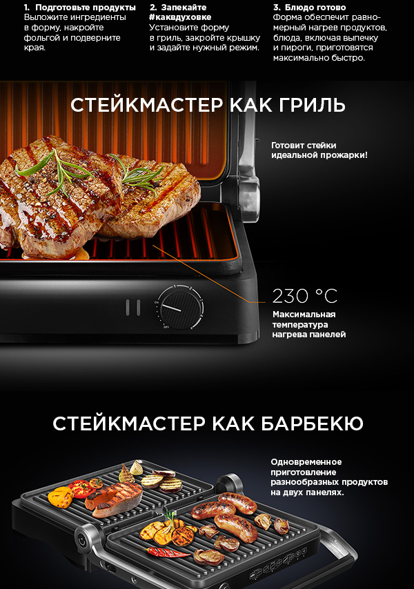 Чтобы превратить SteakMaster в барбекю-жаровню, раскройте гриль на 180 градусов. Площадь для приготовления увеличится в два раза! На одной стороне вы можете обжаривать мясо, а на другой — булочки для бургеров или нарезанные овощи на гарнир. Через несколько минут сытная закуска для всей семьи будет готова.