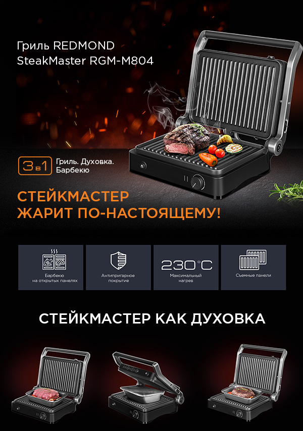 REDMOND RGM-M804 — функциональный гриль «3 в 1», в котором удобно жарить, делать барбекю и запекать, как в духовке. Качественное и прочное антипригарное покрытие позволяет готовить практически без масла и жиров, а также без труда очищать гриль после использования. Благодаря компактным размерам, гриль можно удобно разместить на кухне или взять с собой на дачу.