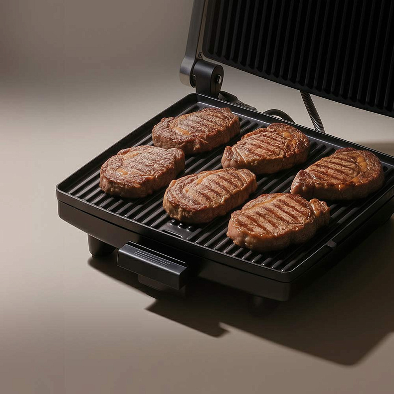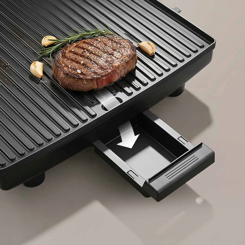Благодаря продуманной конструкции панелей стейк действительно жарится, а не варится в собственном соку. Поверхности расположены под наклоном и эффективно отводят лишний жир и влагу в специальный поддон. Это позволяет сформировать аппетитную корочку снаружи и сохранить сочность внутри.