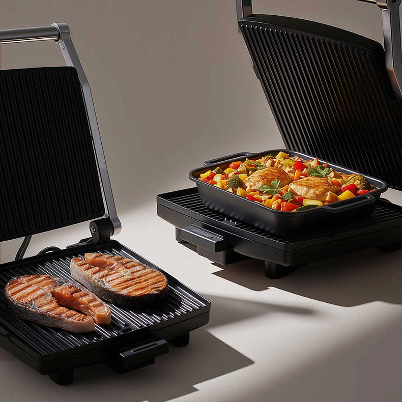 Увеличенные панели размером 265 × 295 мм позволяют готовить сразу на семью или большую компанию. Больше не нужно делить процесс на несколько этапов — все блюда приготовятся одновременно и равномерно. Расширенная рабочая поверхность раскрывает полный потенциал гриля, сохраняя сочность и текстуру каждого ингредиента.
