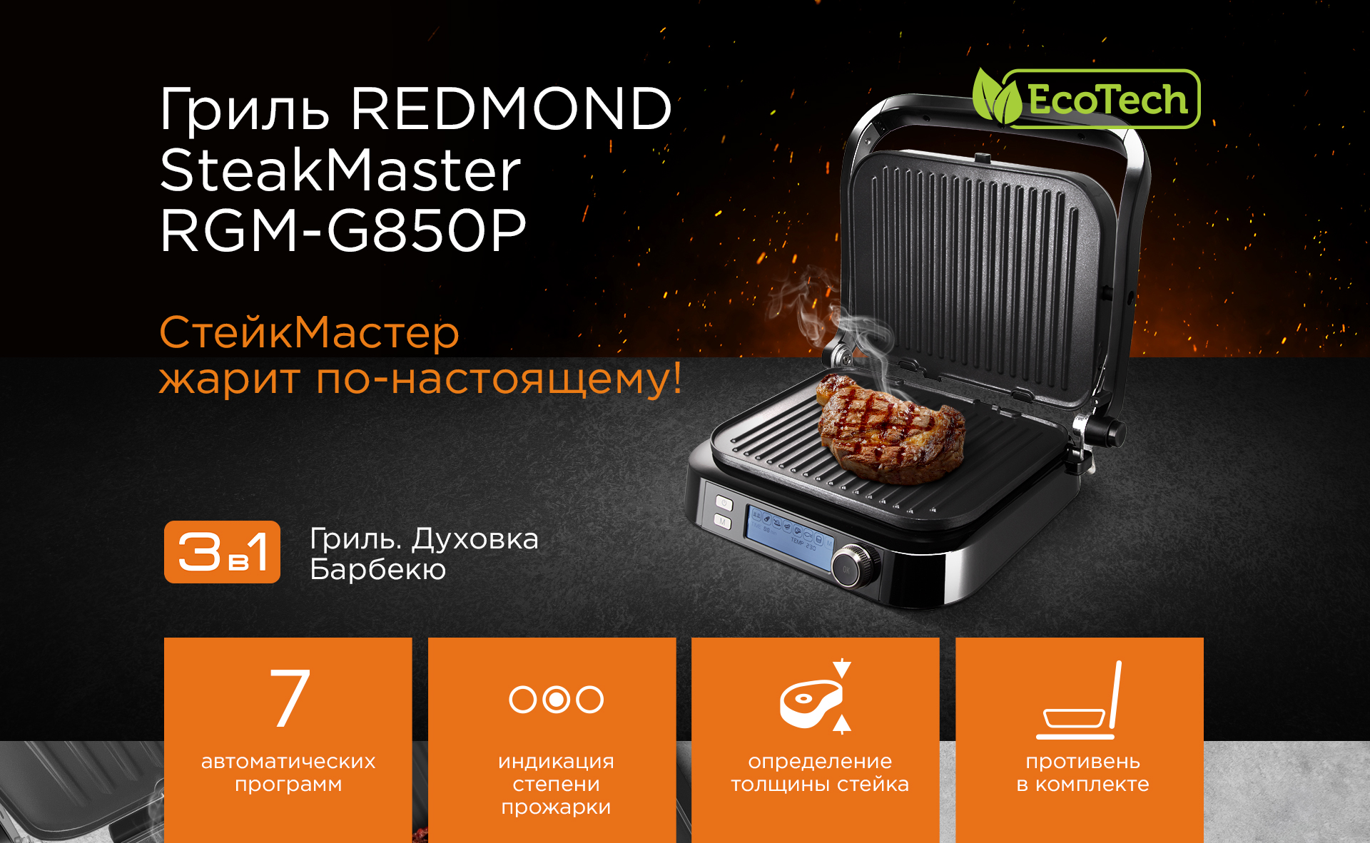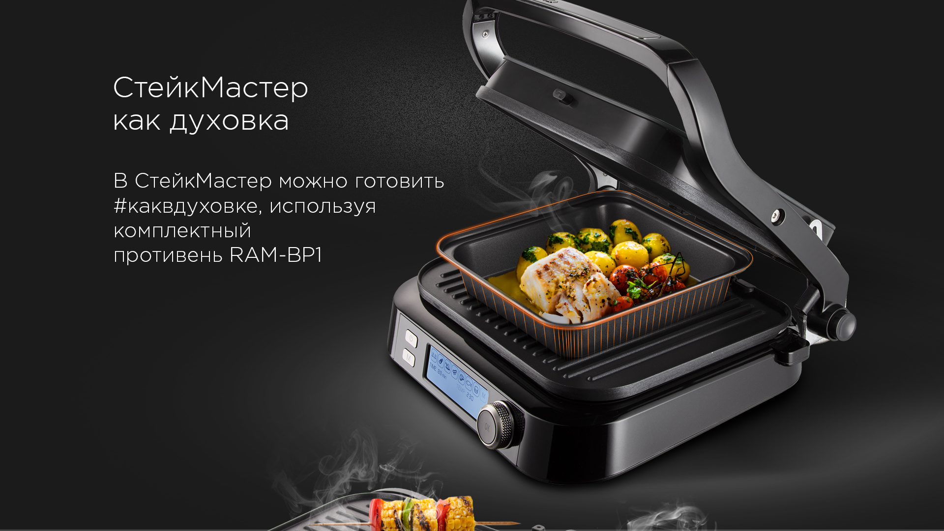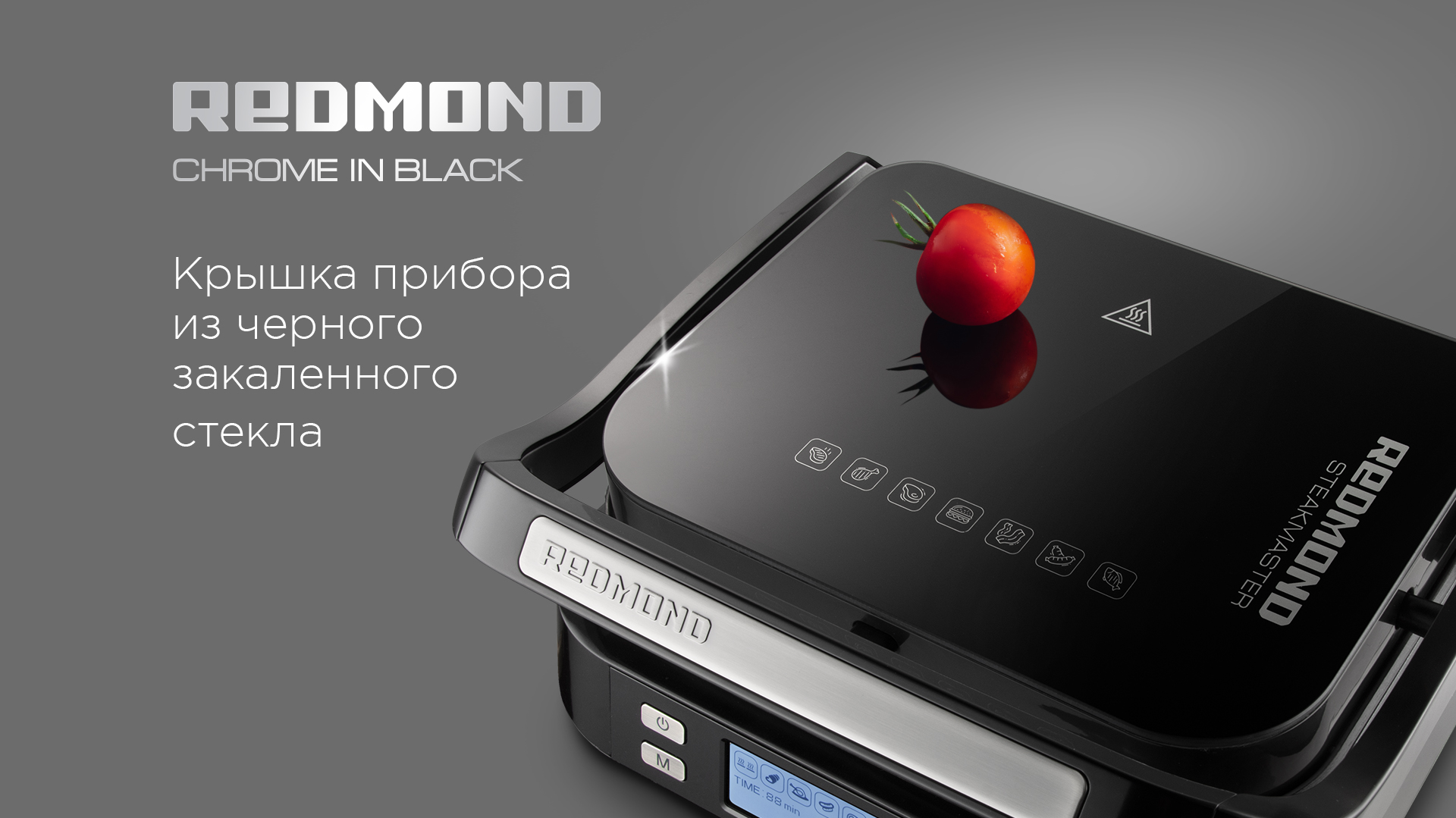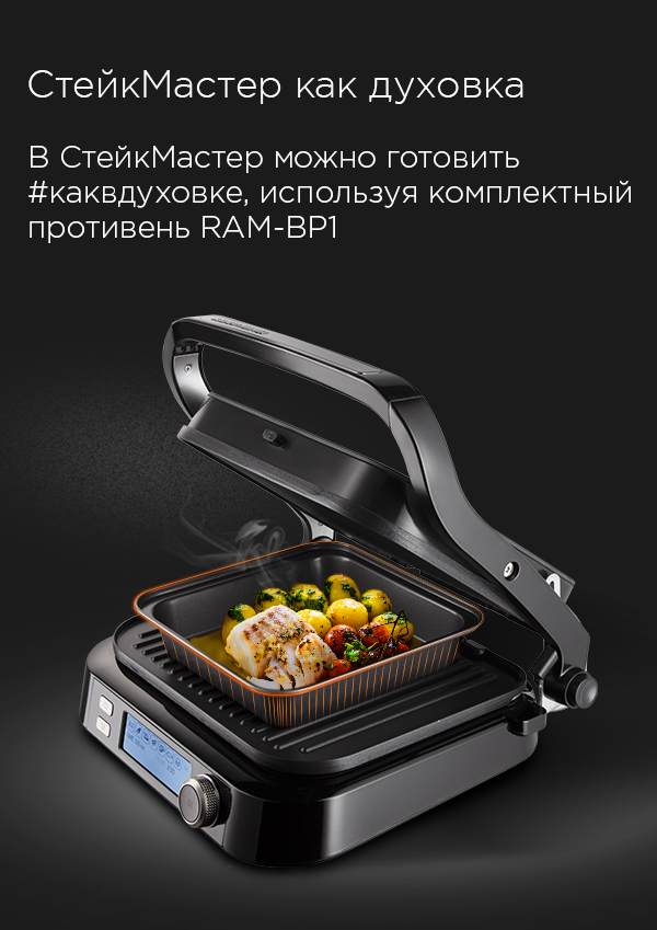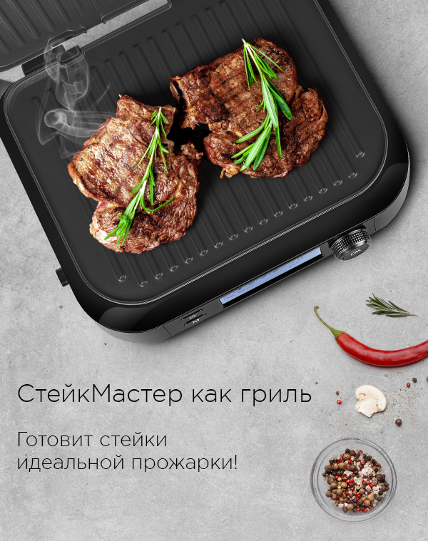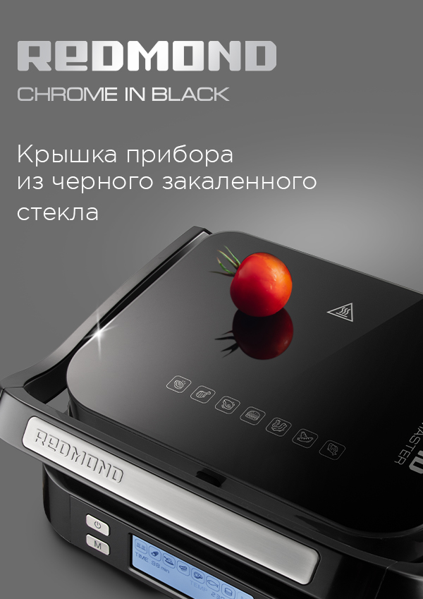 SteakMaster RGM-G850P — мощный универсальный прибор 3 в 1, который работает как прижимной гриль, компактный духовой шкаф и барбекю-жаровня. С его помощью сытные блюда, десерты и выпечка приготовятся в два раза быстрее, чем на обычной плите. Модель выполнена в стиле дизайнерской серии Chrome&Black: лаконичный черный корпус дополнен хромированными деталями, глянцевая крышка прибора выполнена из черного закаленного стекла.