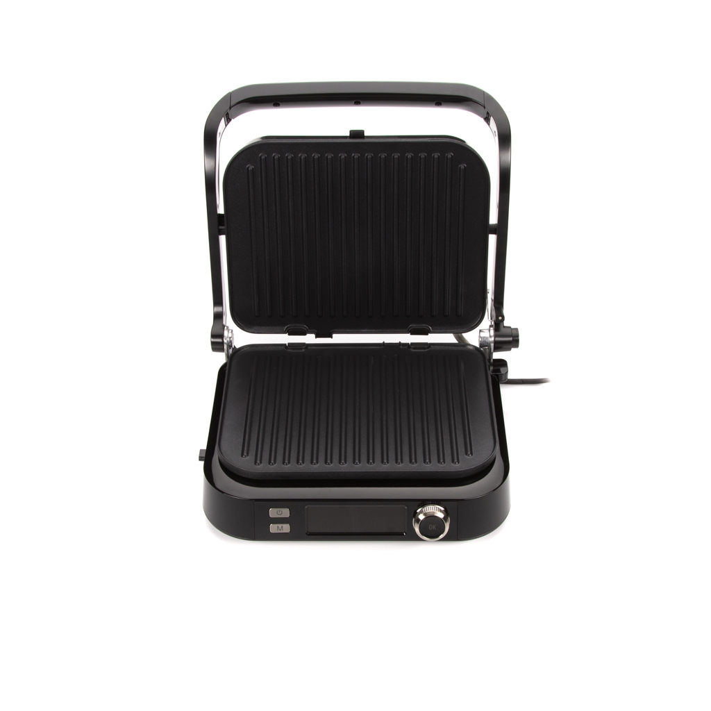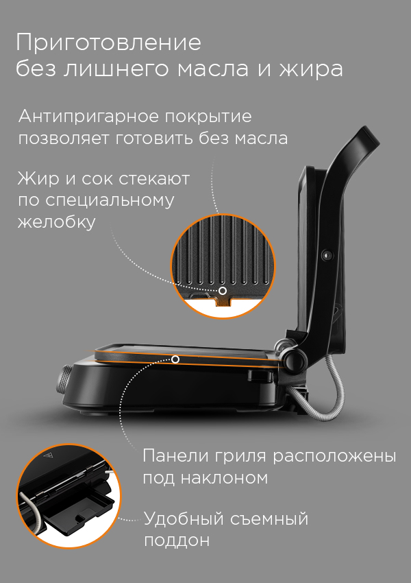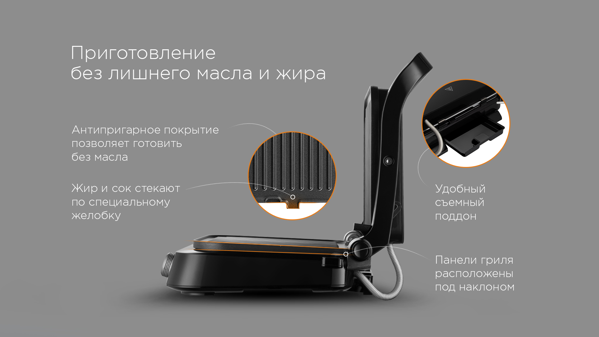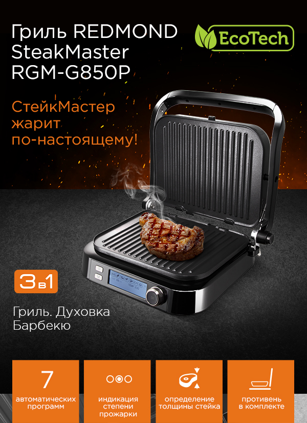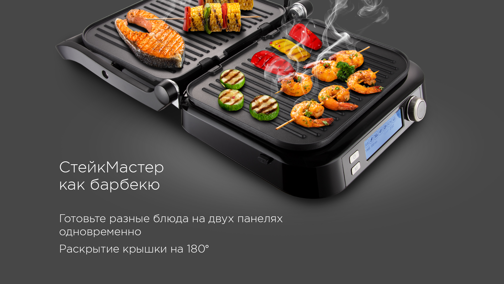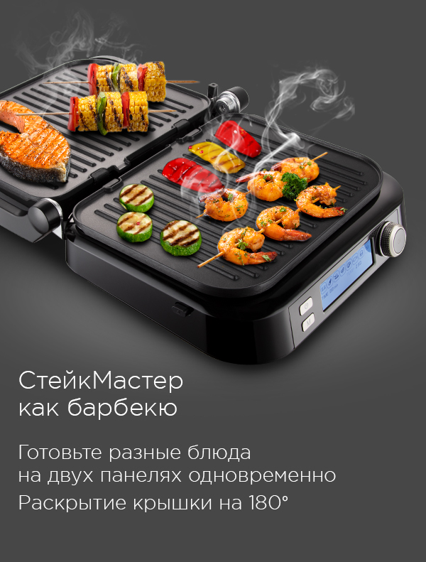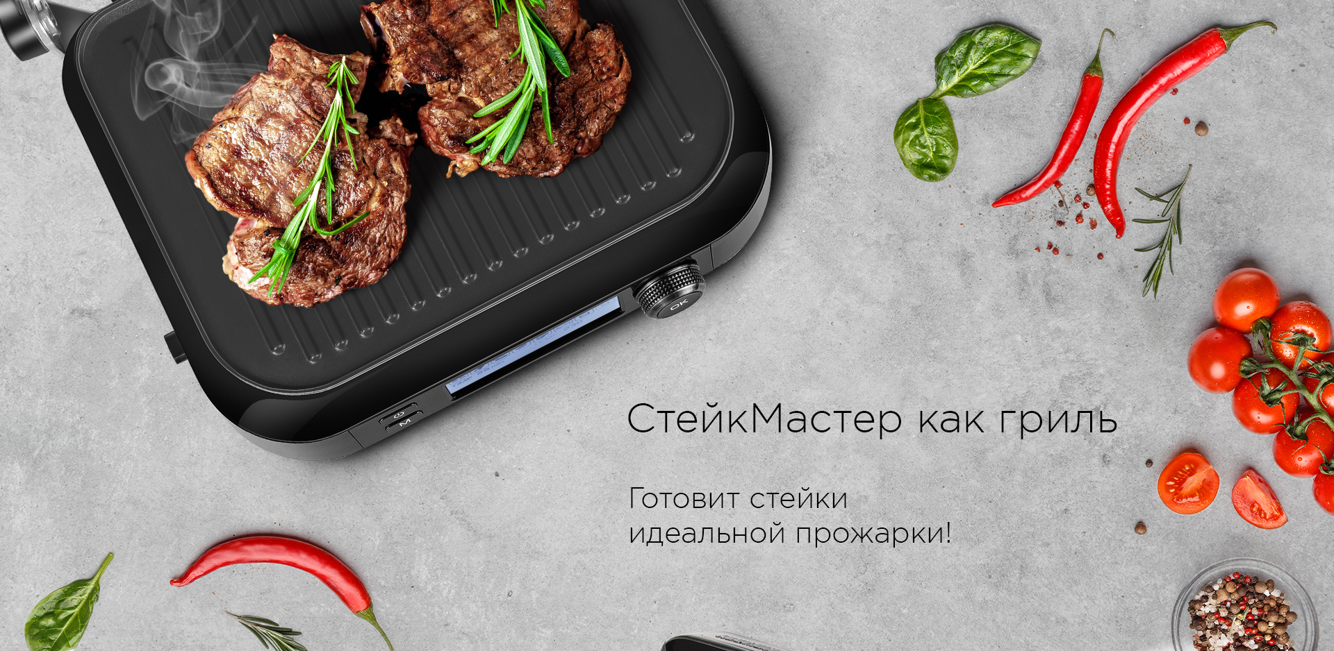 SteakMaster RGM-G850P — мощный универсальный прибор 3 в 1, который работает как прижимной гриль, компактный духовой шкаф и барбекю-жаровня. С его помощью сытные блюда, десерты и выпечка приготовятся в два раза быстрее, чем на обычной плите. Модель выполнена в стиле дизайнерской серии Chrome&Black: лаконичный черный корпус дополнен хромированными деталями, глянцевая крышка прибора выполнена из черного закаленного стекла.