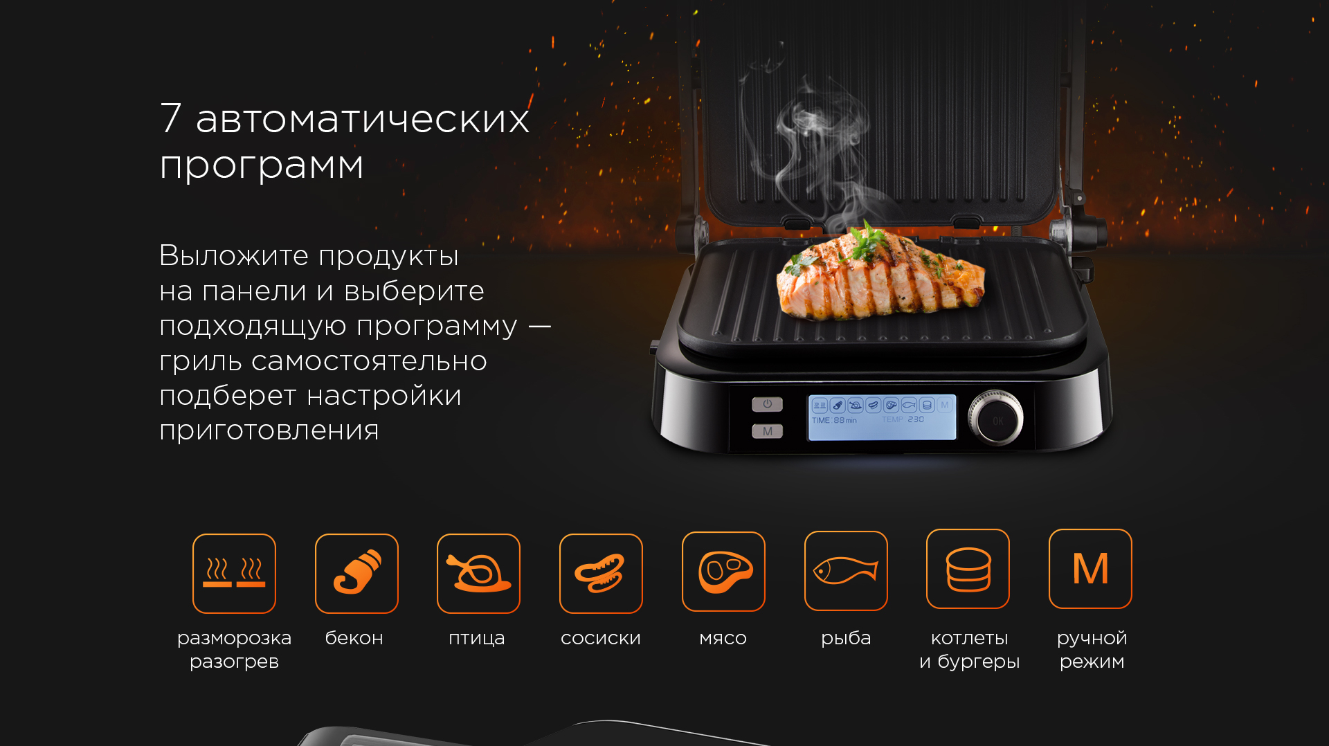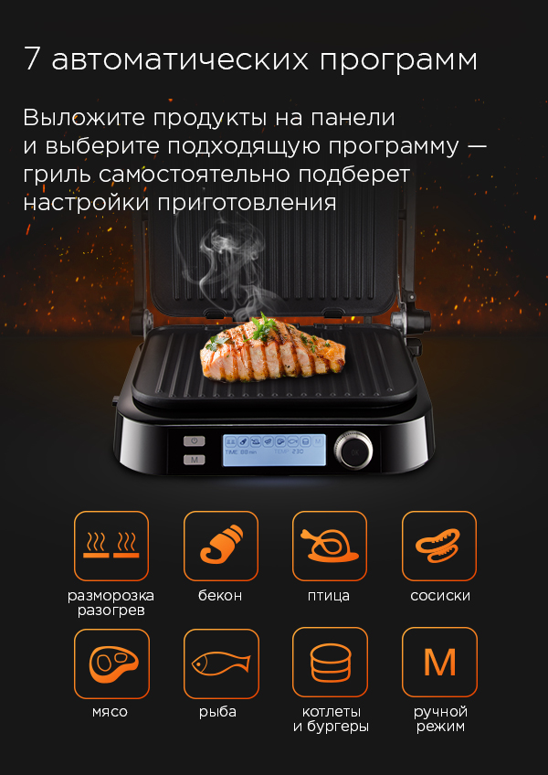 Со SteakMaster легко приготовить аппетитные и сочные блюда гриль. Просто выложите ингредиенты на панели и выберите одну из 7 автоматических программ: БЕКОН, ПТИЦА, СОСИСКИ, МЯСО, РЫБА, КОТЛЕТЫ И БУРГЕРЫ, РАЗМОРОЗКА. Устройство начнет нагрев до предустановленной температуры, определит толщину продукта и оптимальное время жарки.