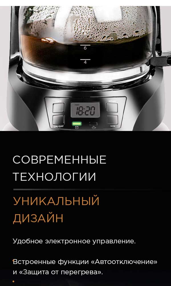 Кофеварка 1510 является совершенным высокотехнологичным устройством – функции «Антикапля» и «Автоподогрев», программируемый таймер, защита от перегрева, автоотключение и, что крайне важно – съёмный многоразовый фильтр.