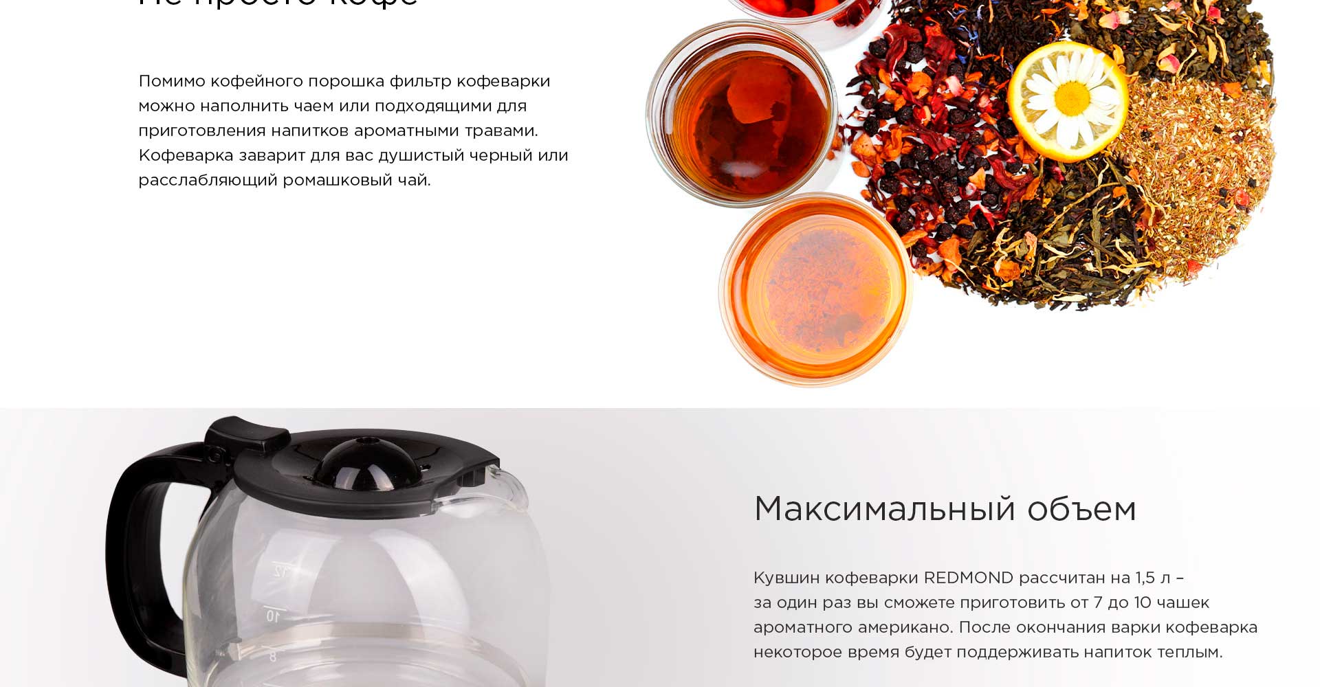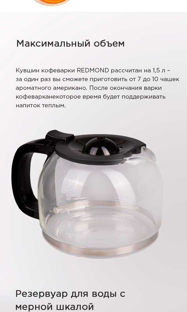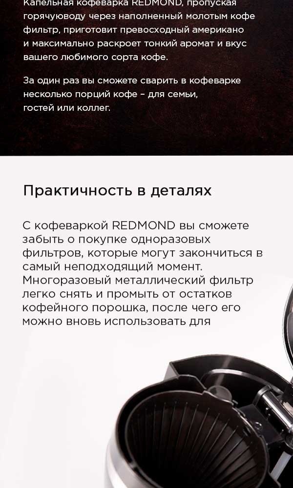 Кофеварка REDMOND RCM-1510 – новый чудо-прибор, позволяющий легко приготовить кофе, чай и травяной отвар. Взгляните на этот элегантный строгий дизайн – он так и манит выпить ещё одну чашечку бесподобного кофе.