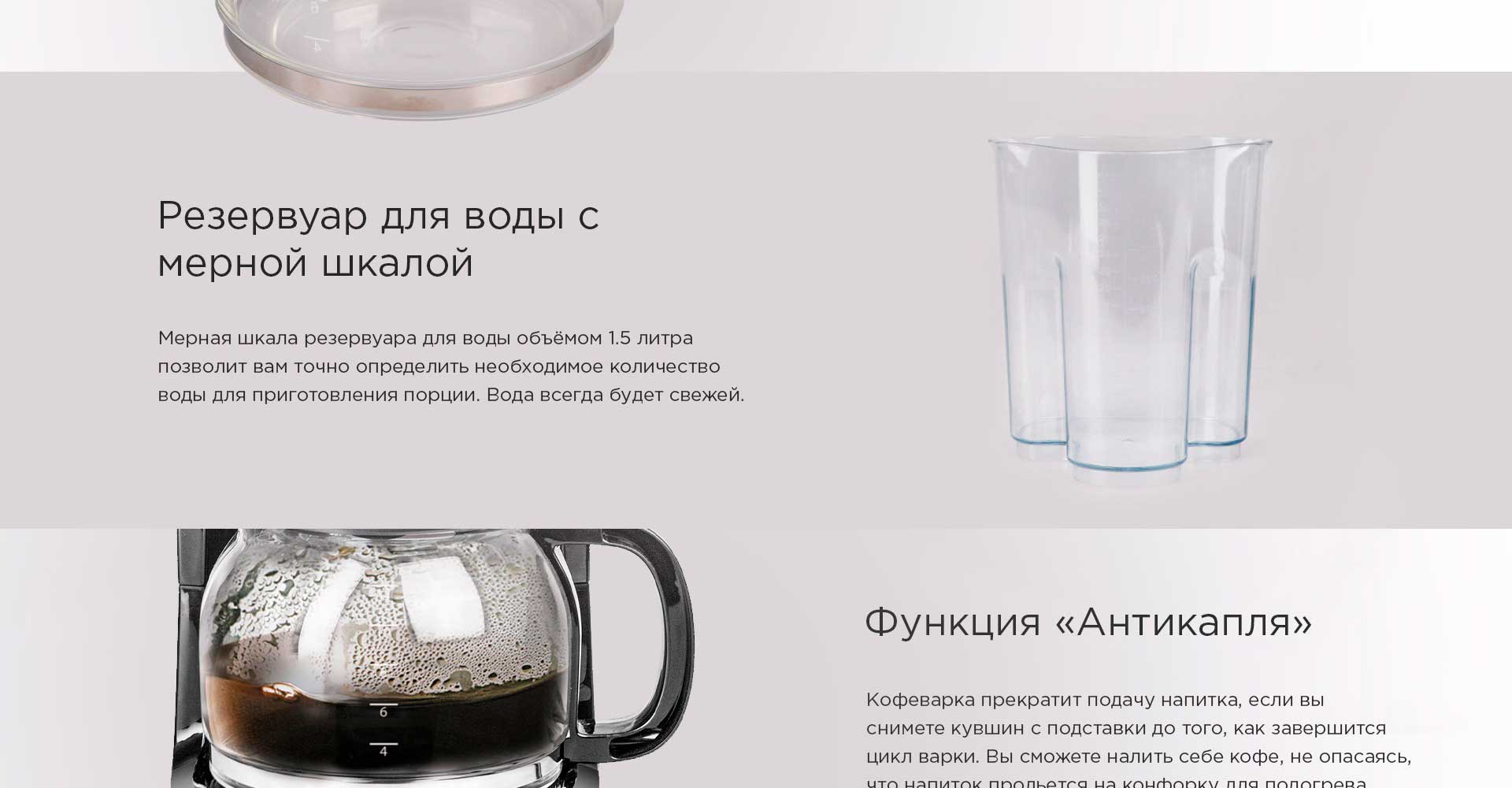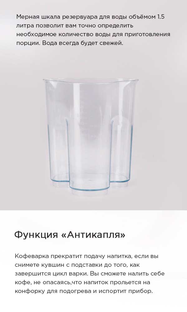 Купили полгода назад, долго выбирали, остановились на этой кофеварке, первые несколько раз антикапля не срабатывала. Потом муж просто правильно поставил все и вуаля, все хорошо работает и не капает когда забираешь чайник. Мы довольны