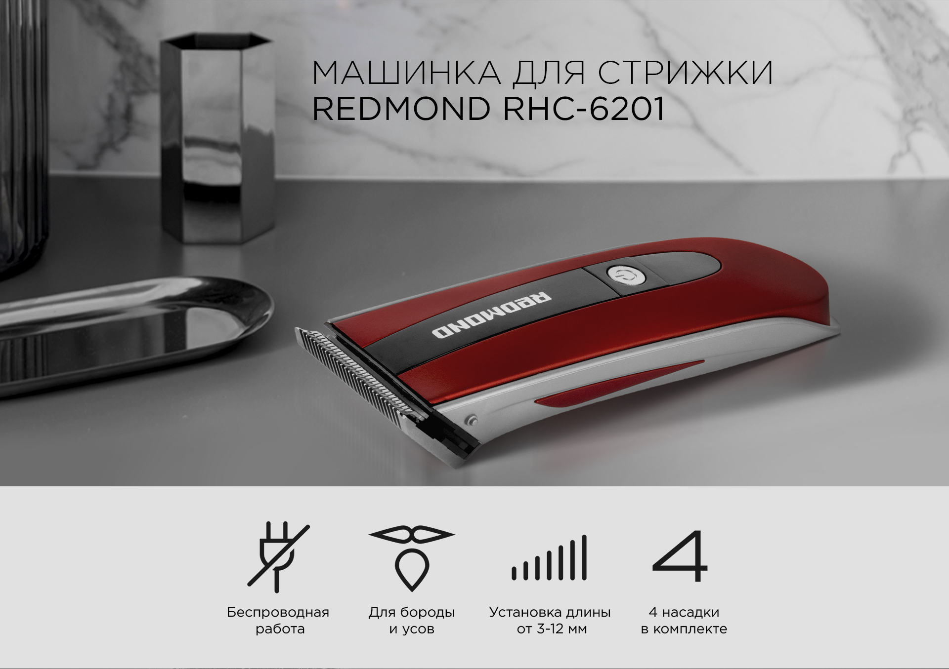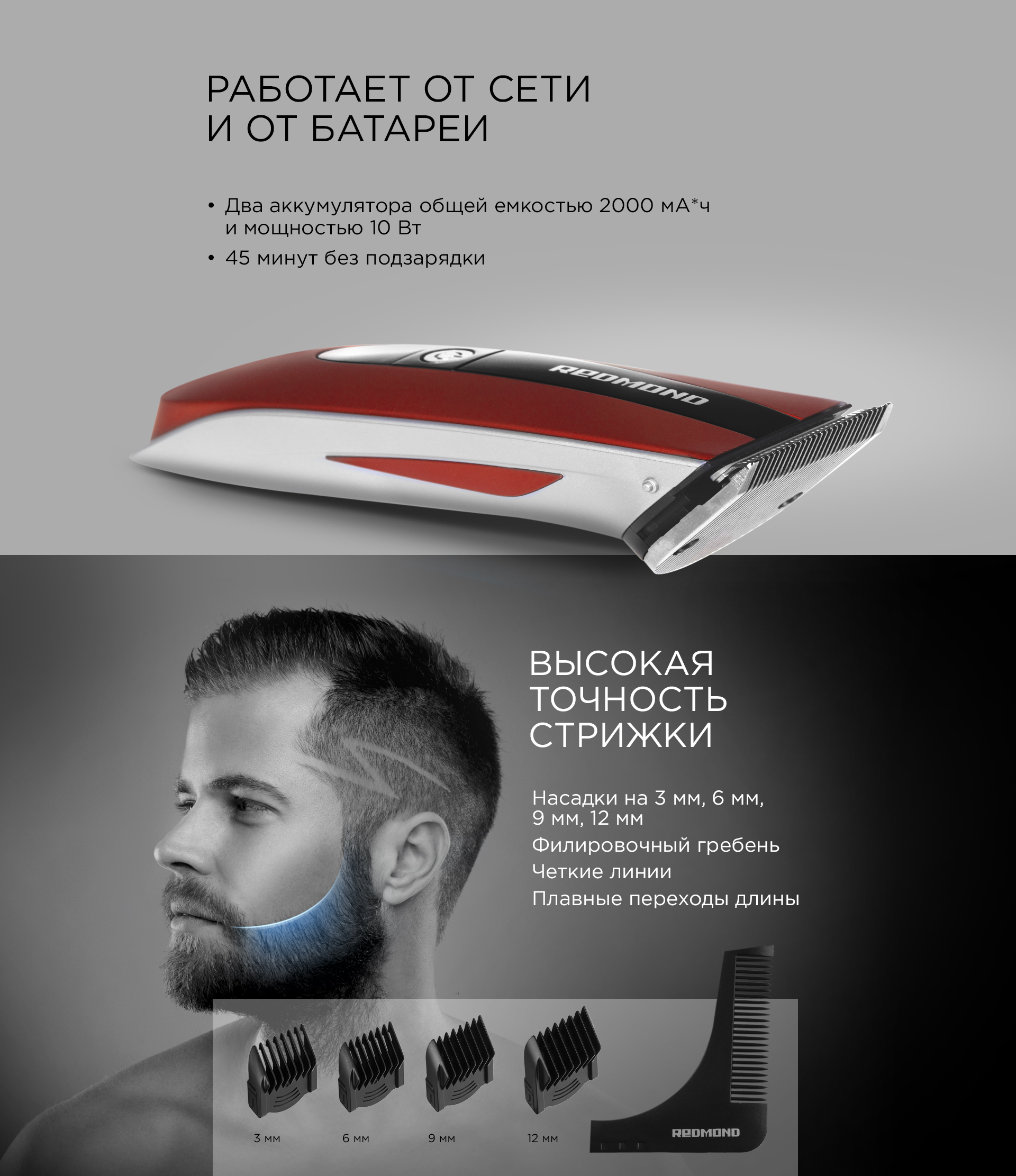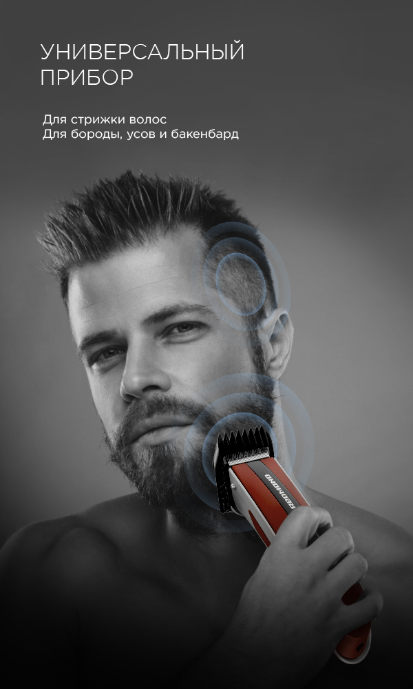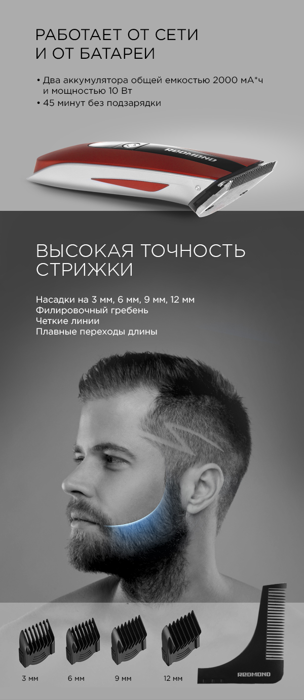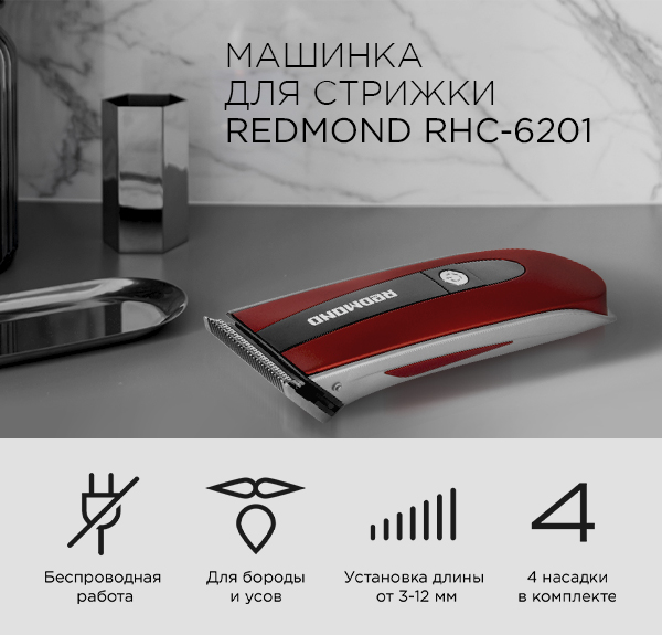 Стильная машинка для стрижки волос REDMOND RHC-6201 – это удобный современный инструмент для ухода за волосами в домашних условиях. Многофункциональный прибор с ярким дизайном подойдет энергичному современному пользователю и поможет создать идеальную прическу, а также скорректировать форму бороды, усов и бакенбард.