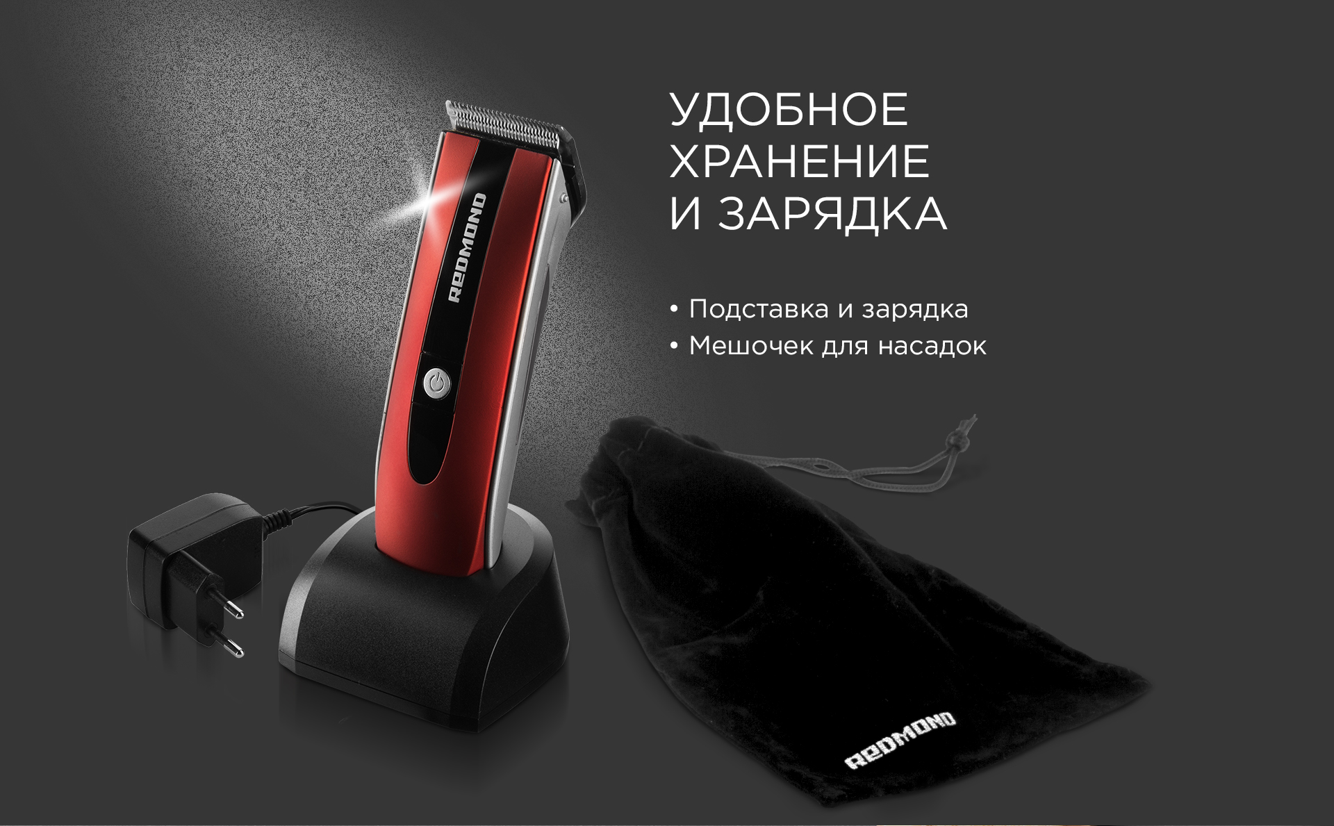 RHC-6201 снабжена комплектной подставкой для хранения и зарядки в вертикальном положении. Таким образом, машинка не займет много места на полке или столике. Для хранения насадок предусмотрен мягкий вельветовый мешочек, который защитит их от пыли и загрязнений.