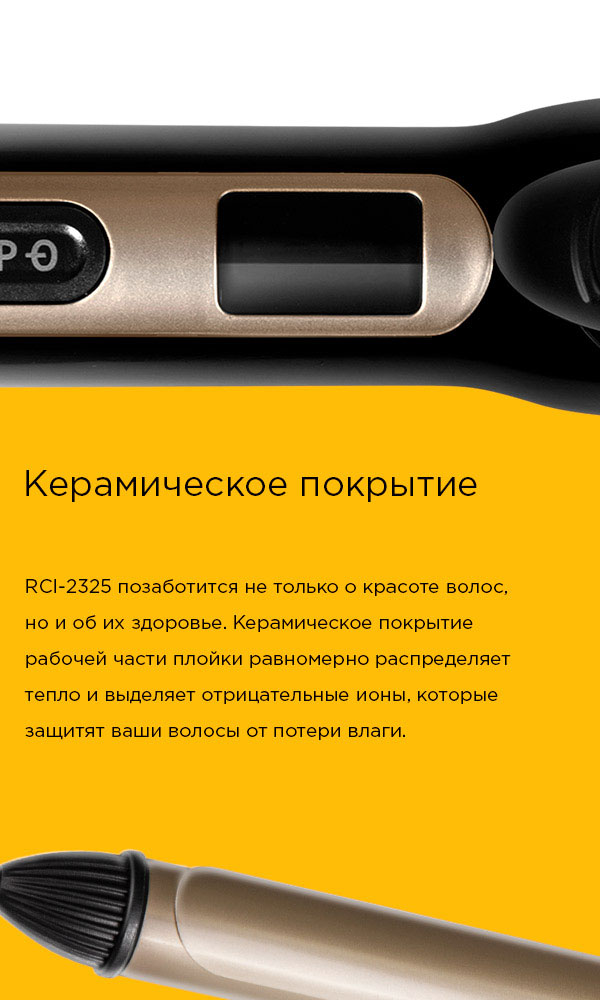 RCI-2325 позаботится не только о красоте волос, но и об их здоровье. Керамическое покрытие рабочей части плойки равномерно распределяет тепло и выделяет отрицательные ионы, которые защитят ваши волосы от потери влаги.
