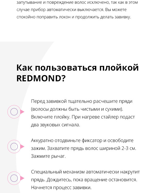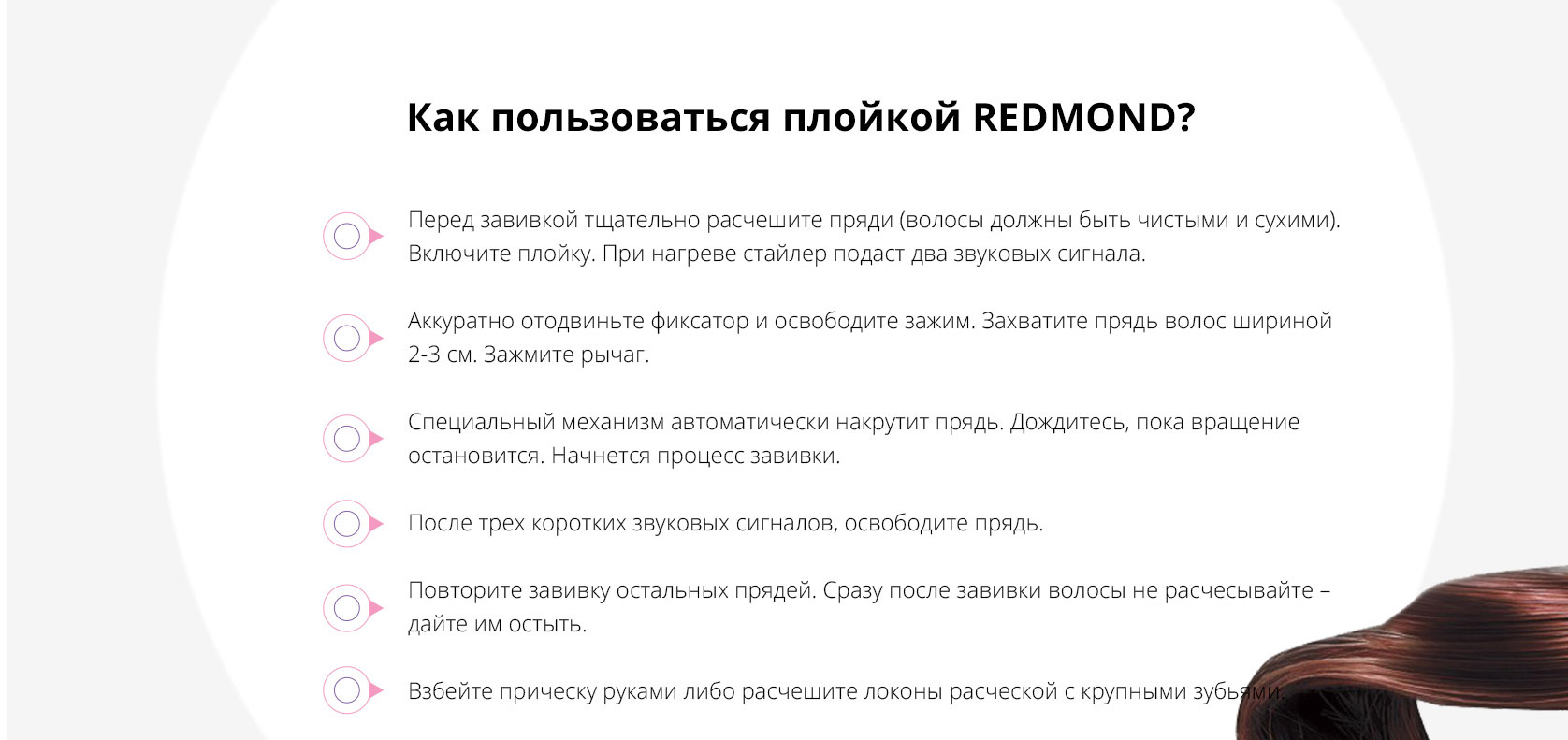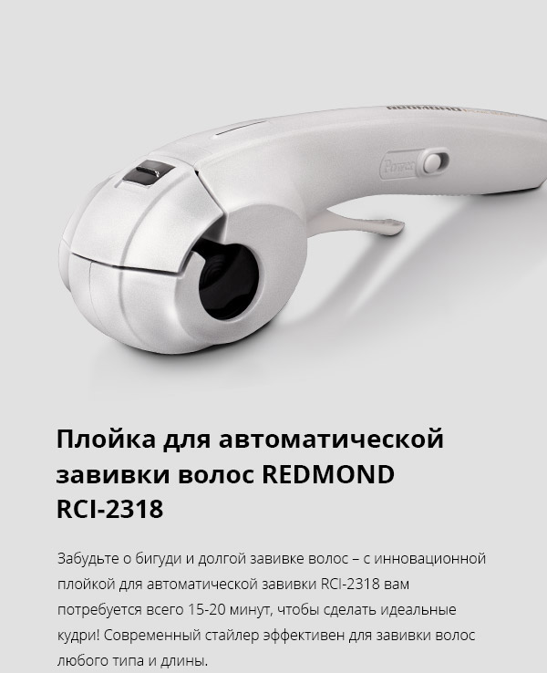 Плойка RCI-2318 уникальная новинка в ассортименте REDMOND. Она автоматически закручивает прядь волос по всей длине и создает ровный красивый локон. Причем времени на это уходит гораздо меньше, чем при использовании классической плойки.