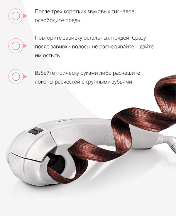 Я пыталась пользоваться обычной плойкой. Но для меня большой секрет как самой себе завить волосы. Очень неудобно. А в случае такой автоматической плойки моих двух рук вполне хватает. Локоны формируются красиво и легко. Звуковой сигнал говорит о том, что пора переходить к следующему локону.