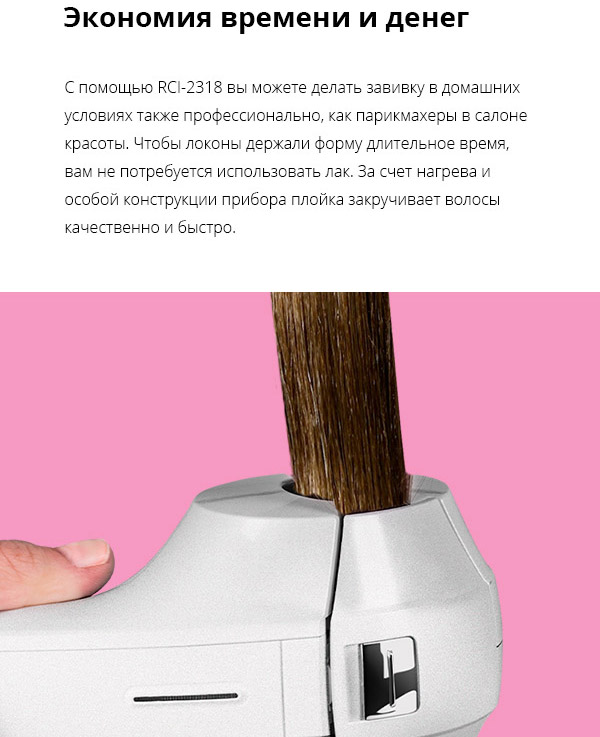 Плойка для волос RCI-2318 – современный стайлер для автоматической завивки волос. Профессиональная плойка позволяет сделать шикарную укладку, как на тонких, так и на густых волосах буквально за 15-20 минут.